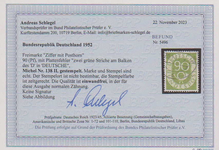 90 Pfg. Posthorn mit seltenem Teilauflagen-Plattenfehler "zwei grüne Striche am Balken des D von DEUTSCHE" gestempelt, siehe Fotoexp. A. Schlegel. Mi. 800,-