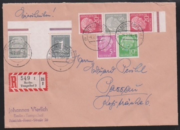 Heuss, Zusammendrucke WZ16bX, S52X und W19X auf R-Brief aus Berlin-Tempelhof (an Peschl)