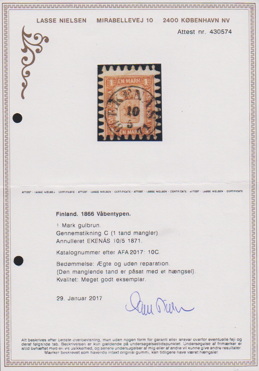 1 Mk. gelbbraun, rechts zwei verkürzte Zähne oben und unten, klarer, zentrischer K1 "Ekenas", eine schwierige Marke von guter Präsentation, Attest Nielsen. Mi. 1500,-