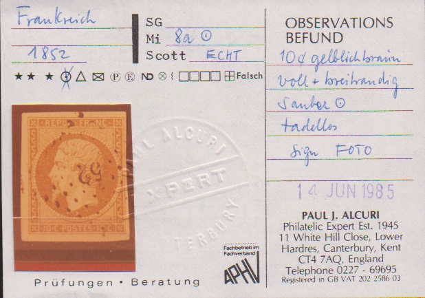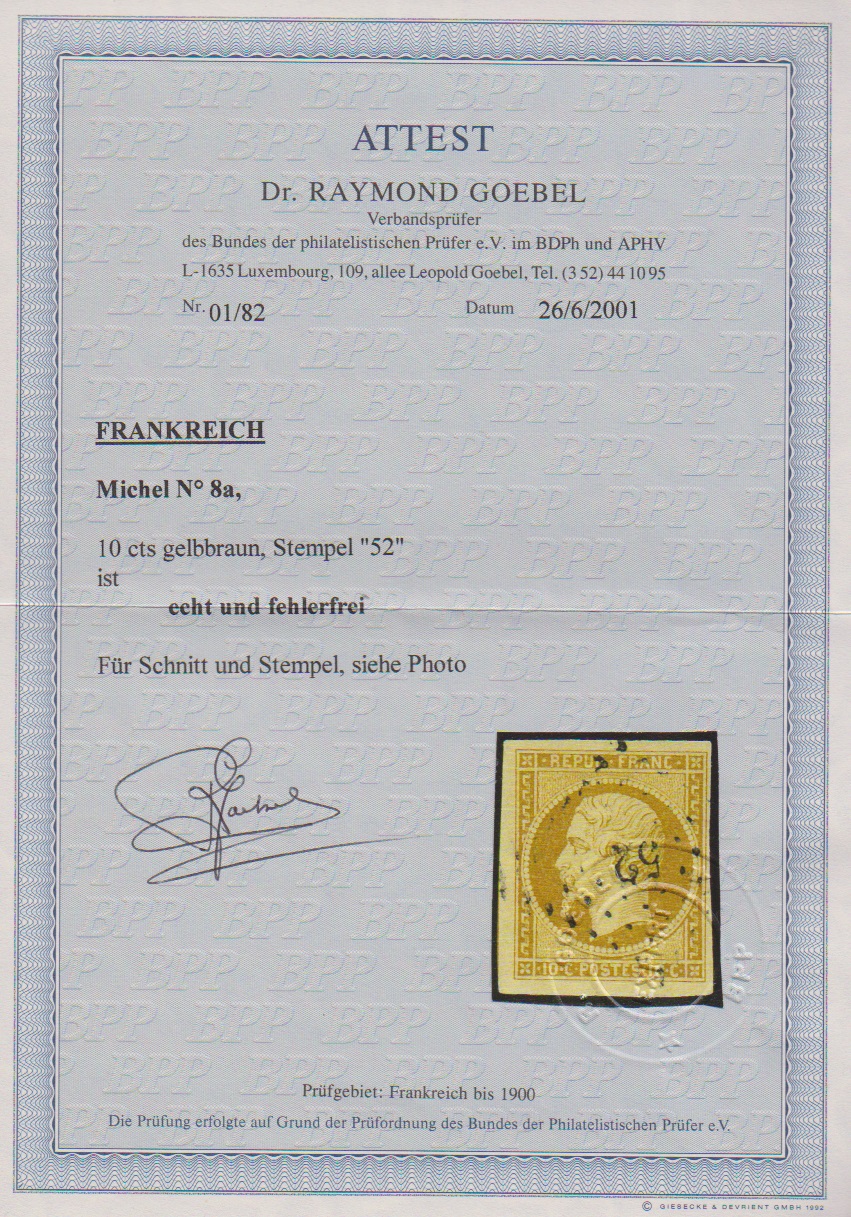 10 C. gelbbraun, teils sehr breitrandiges Kabinettstück mit PC "52", Attest Goebel und Fotoexp. Alcuri. Mi. 700,-