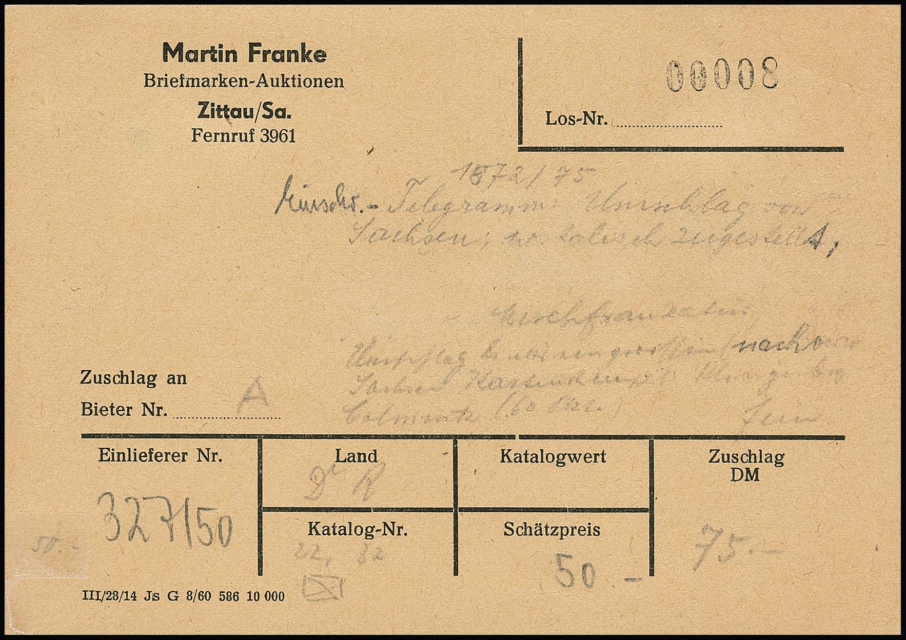 5 Gr. ockerbraun, perfektes Exemplar in Währungs-Mischfrankatur mit 5 Pfge. purpur (re. oben durch Randklebung zwei Zähnchen stumpf) auf blauem Vordruck-Telegramm-Couvert der Königl. Sächsischen Telegraphen-Station mit nachverw. Ra3 "Klingenberg-Colmitz", 19.IV.1875, nach Frauenstein. Völlig ursprüngliche Gebrauchserhaltung, Couvert mit leichten Faltspuren ausserhalb bzw. Papierfehler links, mit erstem R-Zettel, eine Seltenheit der Brustschild-Ausgaben (beiliegend eine Uralt-Loskarte der Auktion Martin Franke/Zittau um 1960, Zuschlag damals 75,- DDR-Mark, später Ebel 9/77 immerhin Kaufpreis fast 3000,- DM)