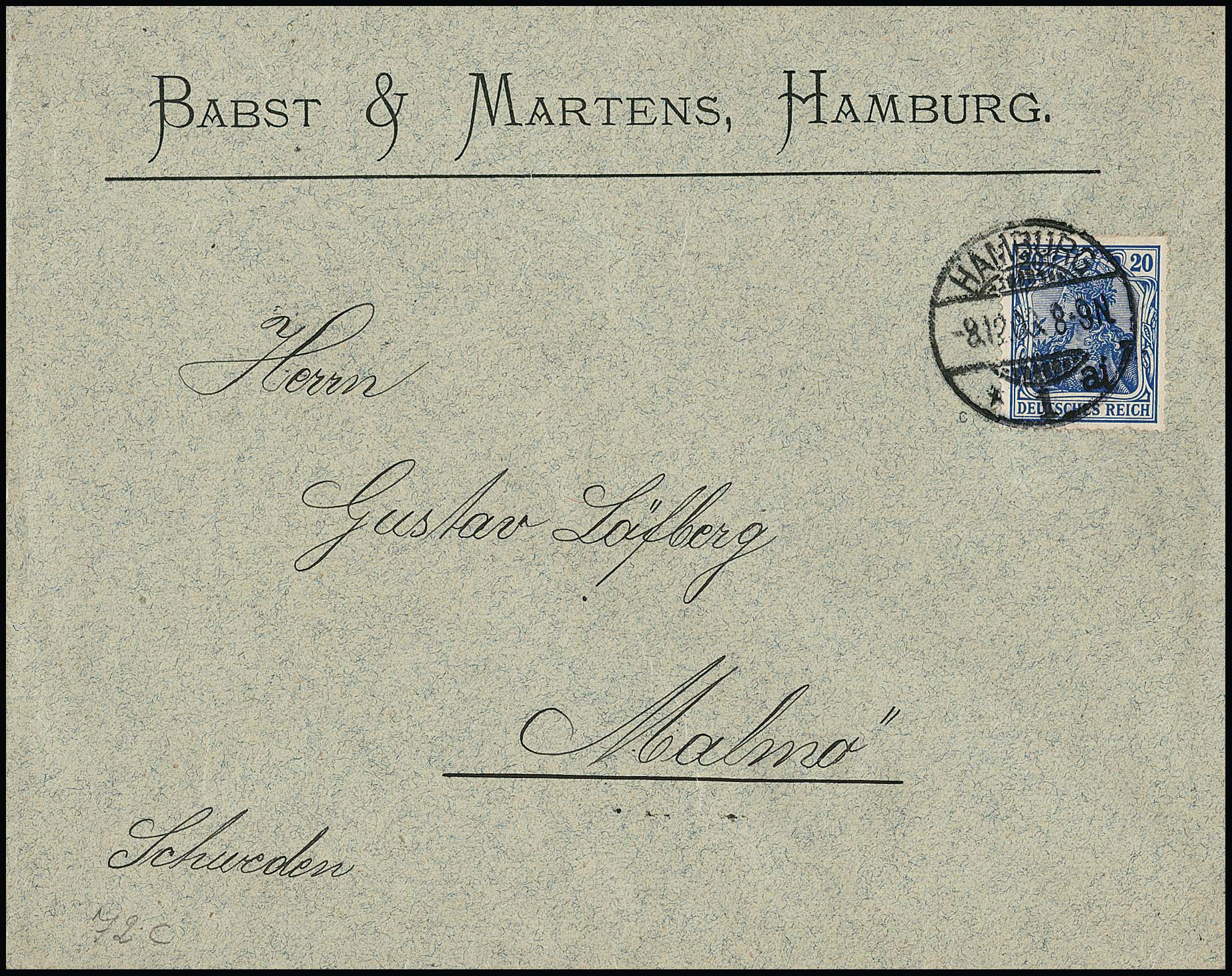 20 Pfg. in der seltensten Nuance grauultramarin einzeln auf Vordruckcouvert von Hamburg 1903 nach Malmö/Schweden. Brief-Seltenheit dieser Ausgabe, auf Brief im Michel nur mit "-.-" bewertet, sign. Jäschke