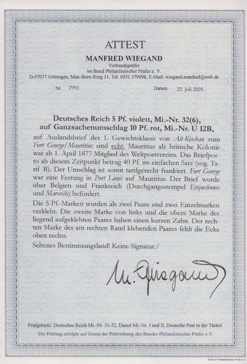 5 Pfg. purpur per sechs (zwei Paare, zwei Werte kurzer Zahn bzw. einmal "eckrund") auf Ganzsache 10 Pfg. rosa, mit K1 "Alt-Kischau" 1878 an einen Artillerie-Leutnant in die Festung Fort George (bei Porto Louis), Mauritius. Seltener UPU-Brief im Tarif B, uns kein weiterer Pfennige-Brief im Transit B nach Mauritius bekannt. Attest Wiegand