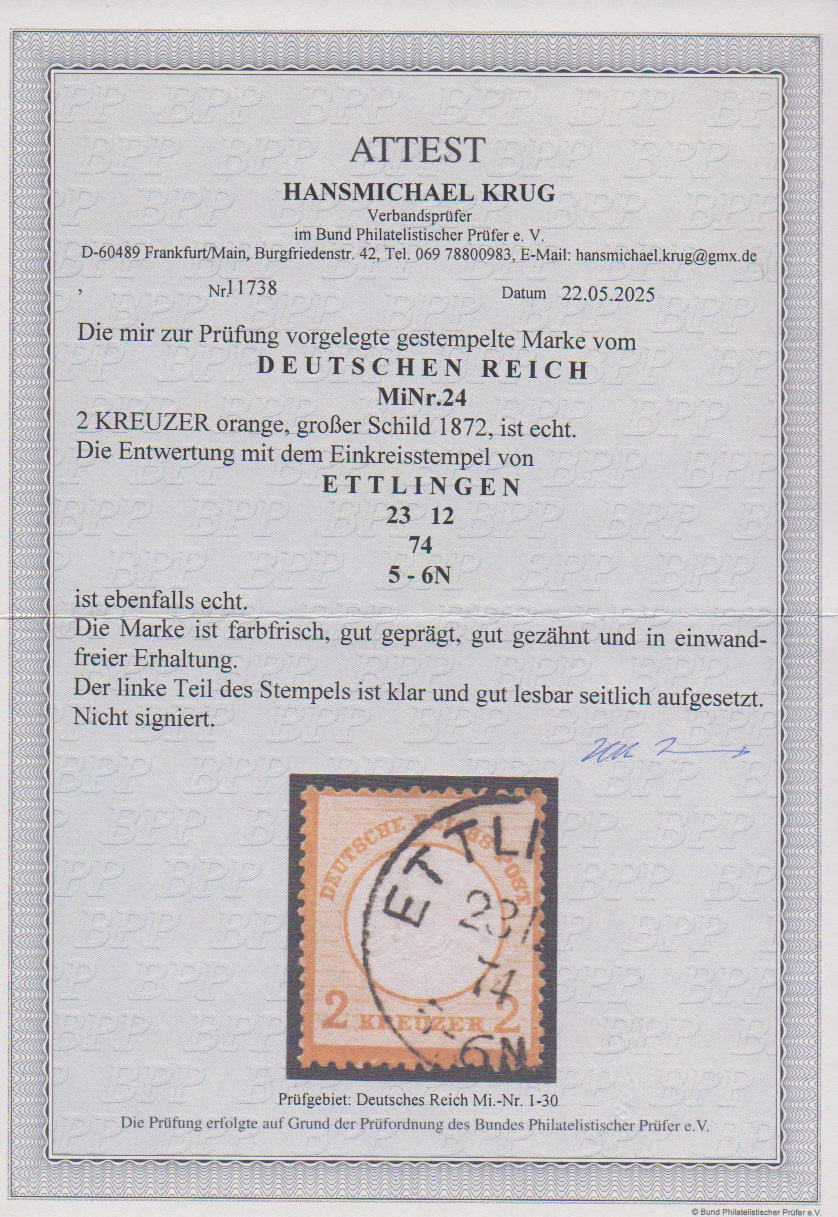 2 Kr. orange, gut gezähntes Kabinettstück mit K1 von Ettlingen, Attest Krug (2025) "in einwandfreier Erhaltung". Mi. 3200,-