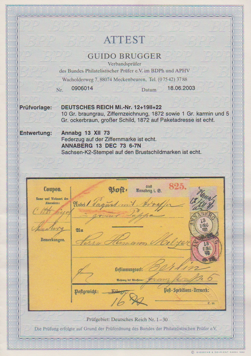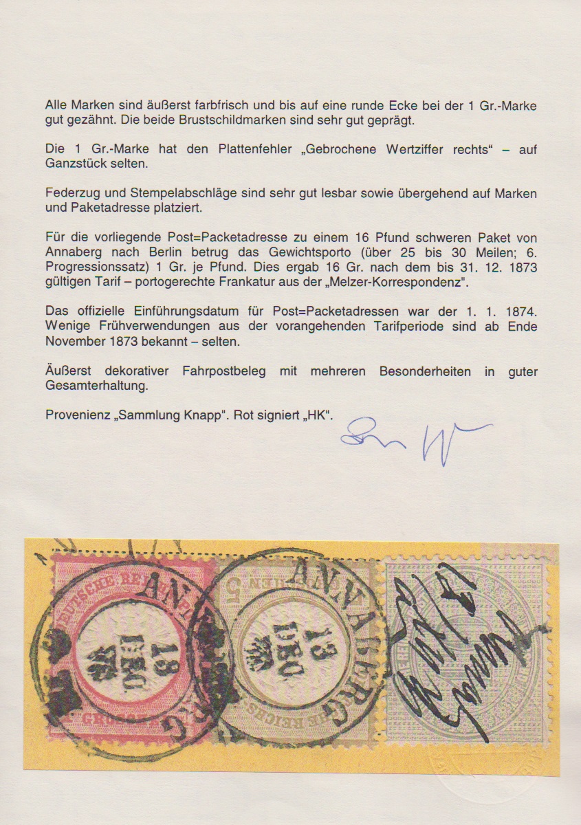 1 Gr. rosa (unbedeutend "runde Ecke") mit Plattenfehler "gebrochene Wertziffer 1 rechts", nebst 10 Gr. grau und 5 Gr. ockerbraun auf kompletter, gelber, ungefalteter Paketkarte aus Annaberg, 13. Dez. 1873. Dekorative Abstempelung und Anordnung der frischen Frankatur. Sowohl mit dem Plattenfehler als auch mit der frühen Verwendung des an sich erst zum 1.1.1874 eingeführten gelben Paketkarten-Formulars sehr selten. Ex Slg. Knapp (rs. Kaufvermerk von diesem "8.7.60 DM 48,- Horst Krause, Gelsenkirchen"). Attest Brugger