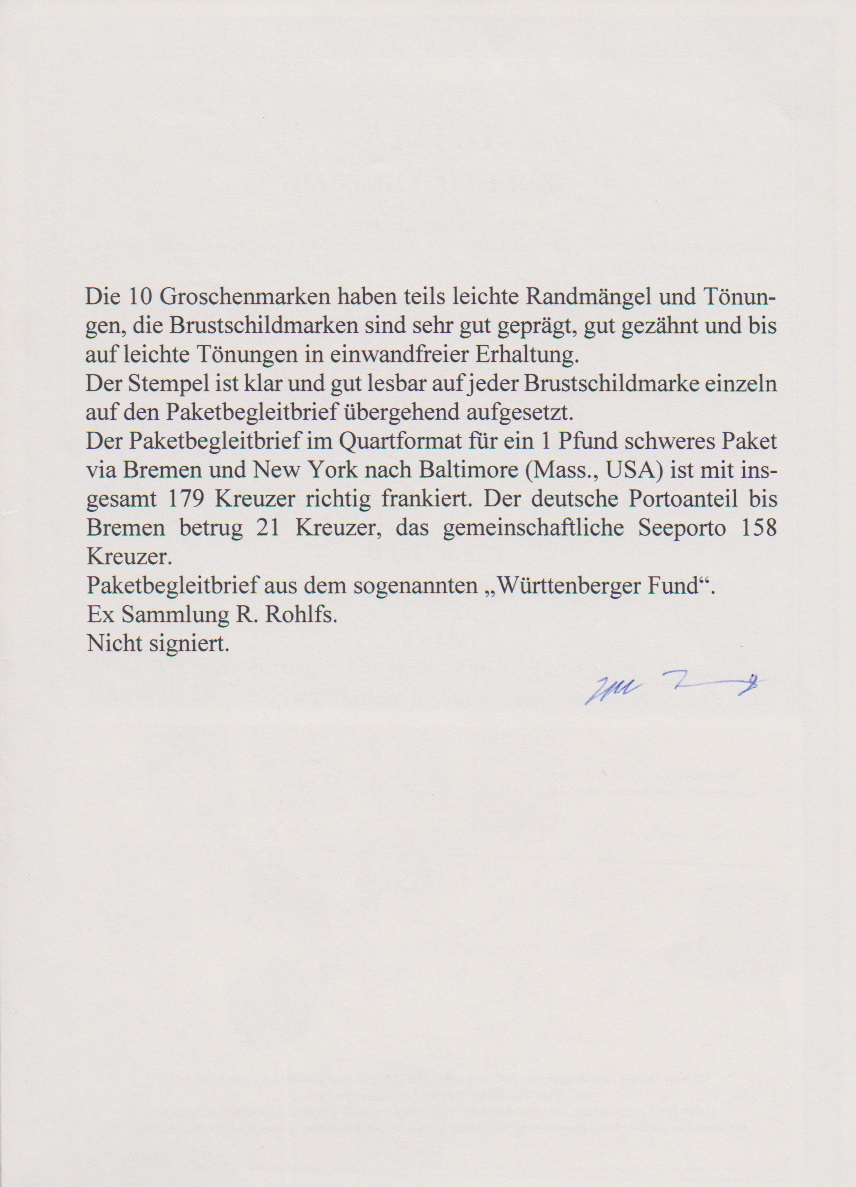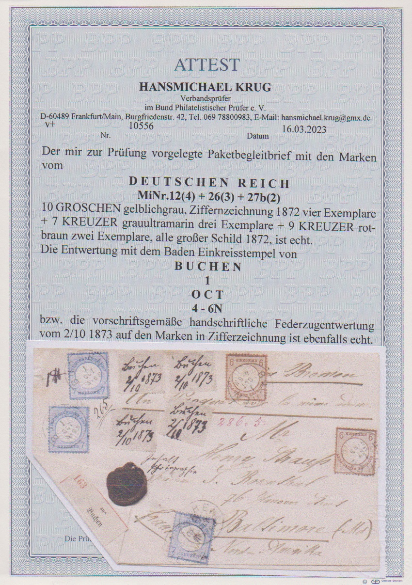 9 Kr. lilabraun per zwei, nebst dreimal 7 Kr. blau sowie viermal 10 Gr. grau auf Übersee-Paketbegleitbrief von Buchen (nachverw. Baden-K1 bzw. hs. Entwertung) aus dem "Württenberger Fund" via Bremen nach Baltimore/USA. Die 10 Groschen teils mininale Randunebenheiten und leichte Tönungen, sonst gut. Seltene 179-Kreuzer-Frankatur mit den vier 10-Groschenmarken und zweimal der Nr. 27b. Ex Sammlungen Rohlfs und Haub (IBRA-Auktion 2023, Zuschlag 2500,- Euro + Aufg.). Attest Krug