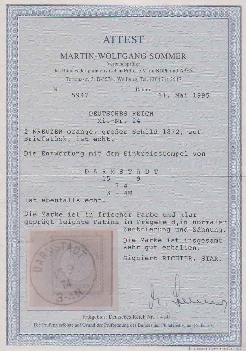2 Kr. orange auf Prachtbriefstück mit klarem K1 "Darmstadt" voll, wirklich belanglose Tönung im Prägefeld, gut sign. Starauschek und Attest Sommer "sehr gut erhalten". Mi. 3200,-