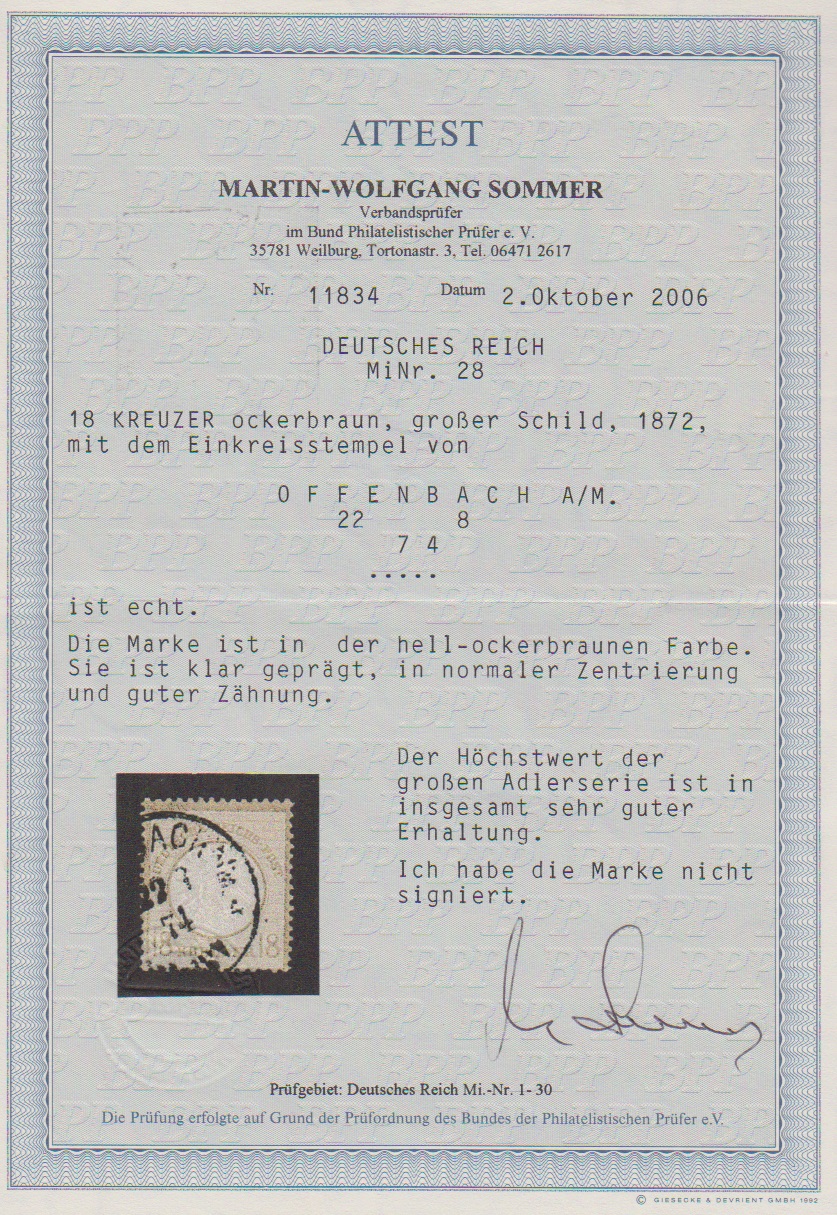 18 Kr. ockerbraun, gut gezähntes Kabinettstück mit K1 von Offenbach, Attest Sommer "sehr gute Erhaltung". Mi. 2800,-