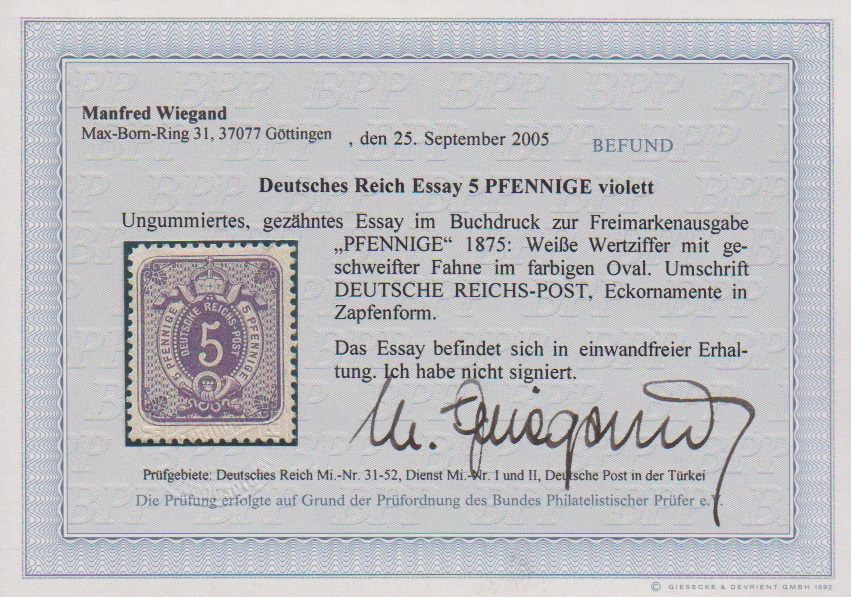 5 Pfge. purpur, seltenes Essay "weiße Wertziffer mit geschweifter Fahne im farbigen Oval", Fotoexp. Wiegand