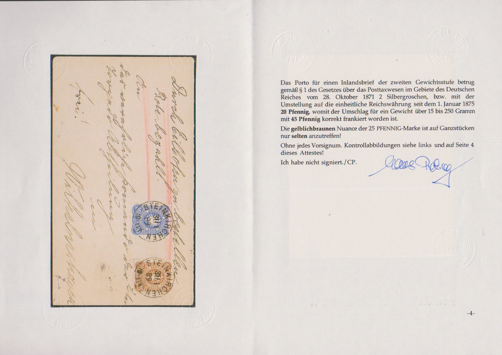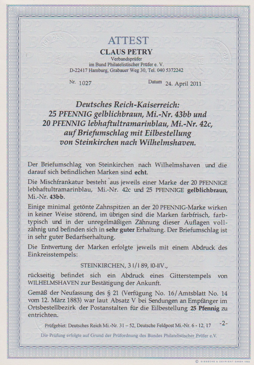 25 Pfg. in der seltensten Farbe gelbbraun in sehr guter Erhaltung, nebst 20 Pfg. ultramarinblau (diese min. getönte Zahnspitzen), auf zentrisch gestempeltem Expreßbrief mit K1 "Steinkirchen" 1889 nach Wilhelmshaven. Briefe mit dieser seltenen Farbnuance gehören zu den Seltenheiten des Sammelgebietes und nur wenige bekannt, Attest Petry. Mi. 3500,-