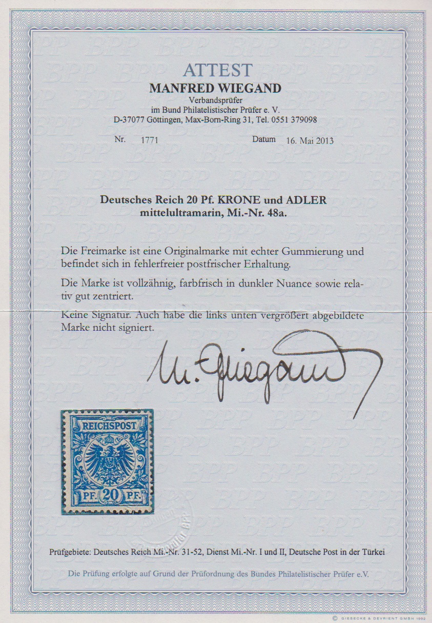 20 Pfg. mittelultramarin, tadellos postfrisches Exemplar der seltenen frühen Auflage, Mi. nur 1500,-, aber völlig unterbewertet, da Auktionszuschläge bis 3700,- Euro + Aufg., Attest Wiegand