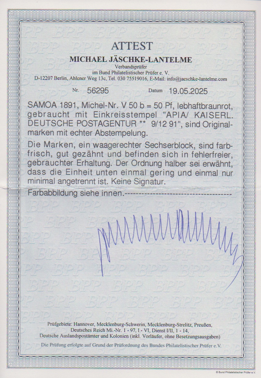 Vorläufer Krone-Adler 50 Pfg. in guter Farbe braunrot im seltenen Sechserblock mit K1 "Apia" vom 9.12.1891, gering angetrennt (ohne Bedeutung). Michel der losen Marken schon 3000,- (!), Attest Jäschke-L.
