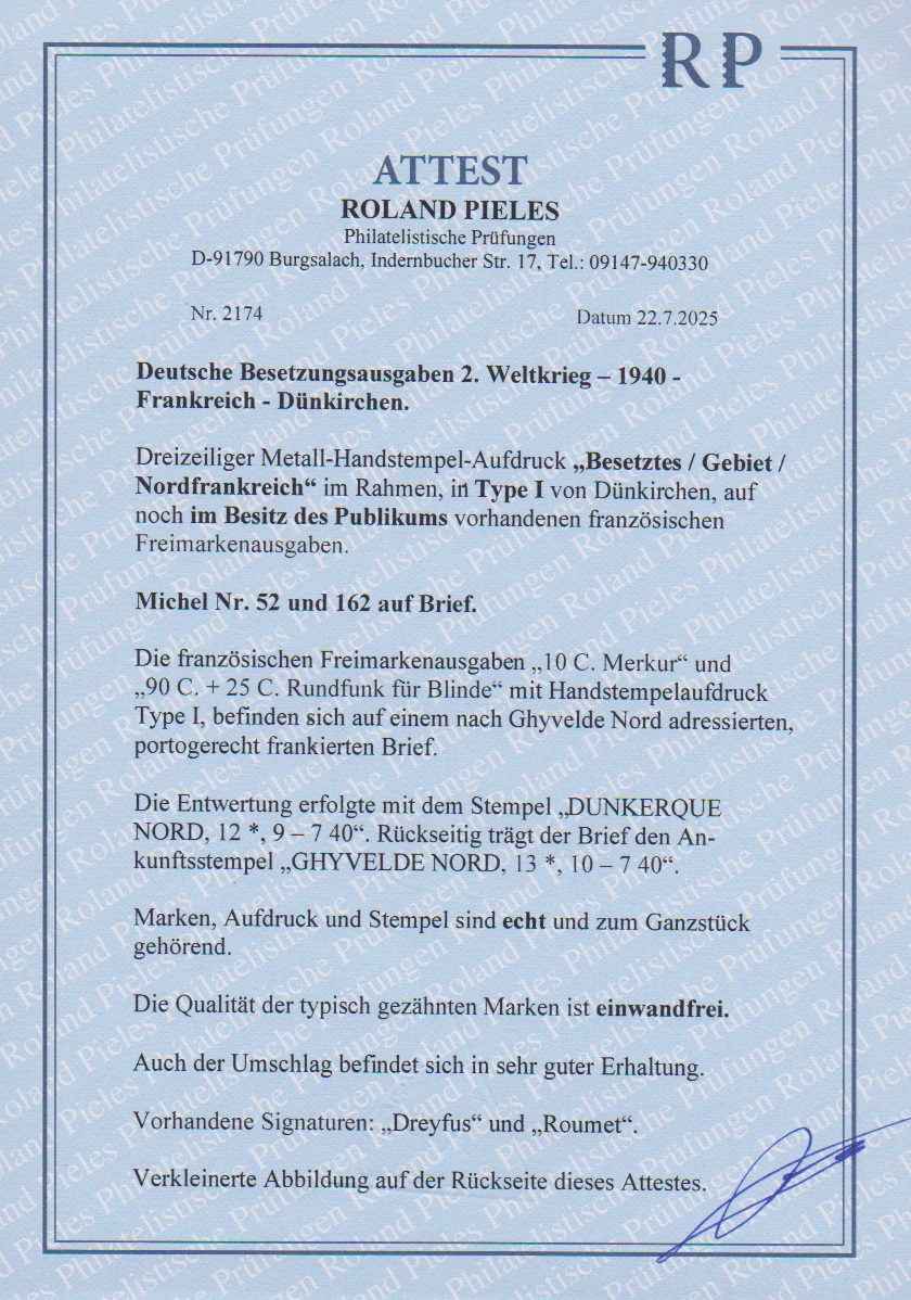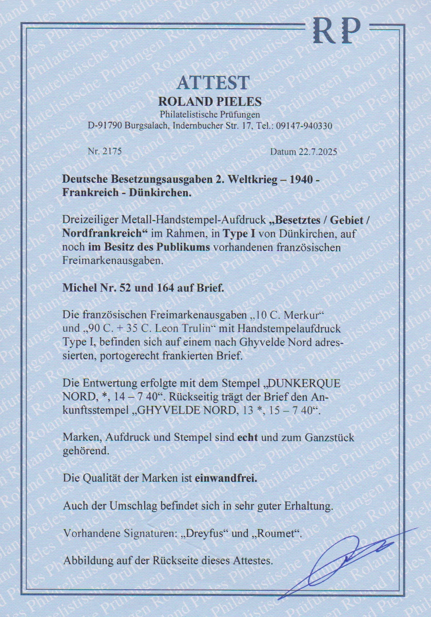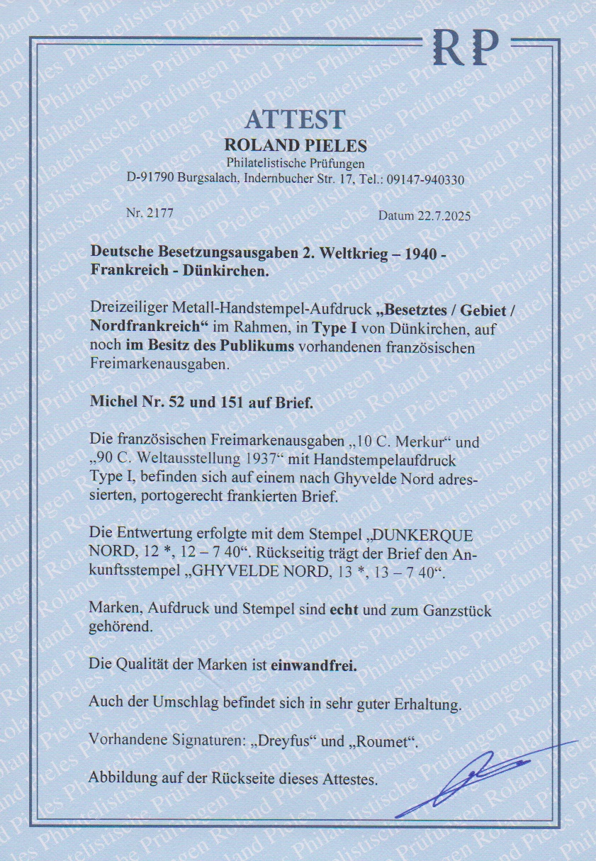 Dünkirchen 10 C. Merkur und 90 C. Weltausstellung, Handstempelaufdruck in Type I auf noch im Besitz des Publikums befindlichen Freimarken, auf portogerechtem Brief von Dünkirchen, 12.7.1940, nach Ghyvelde. Sign. Dreyfus, Roumet und Attest Pieles. Mi. 1000,-