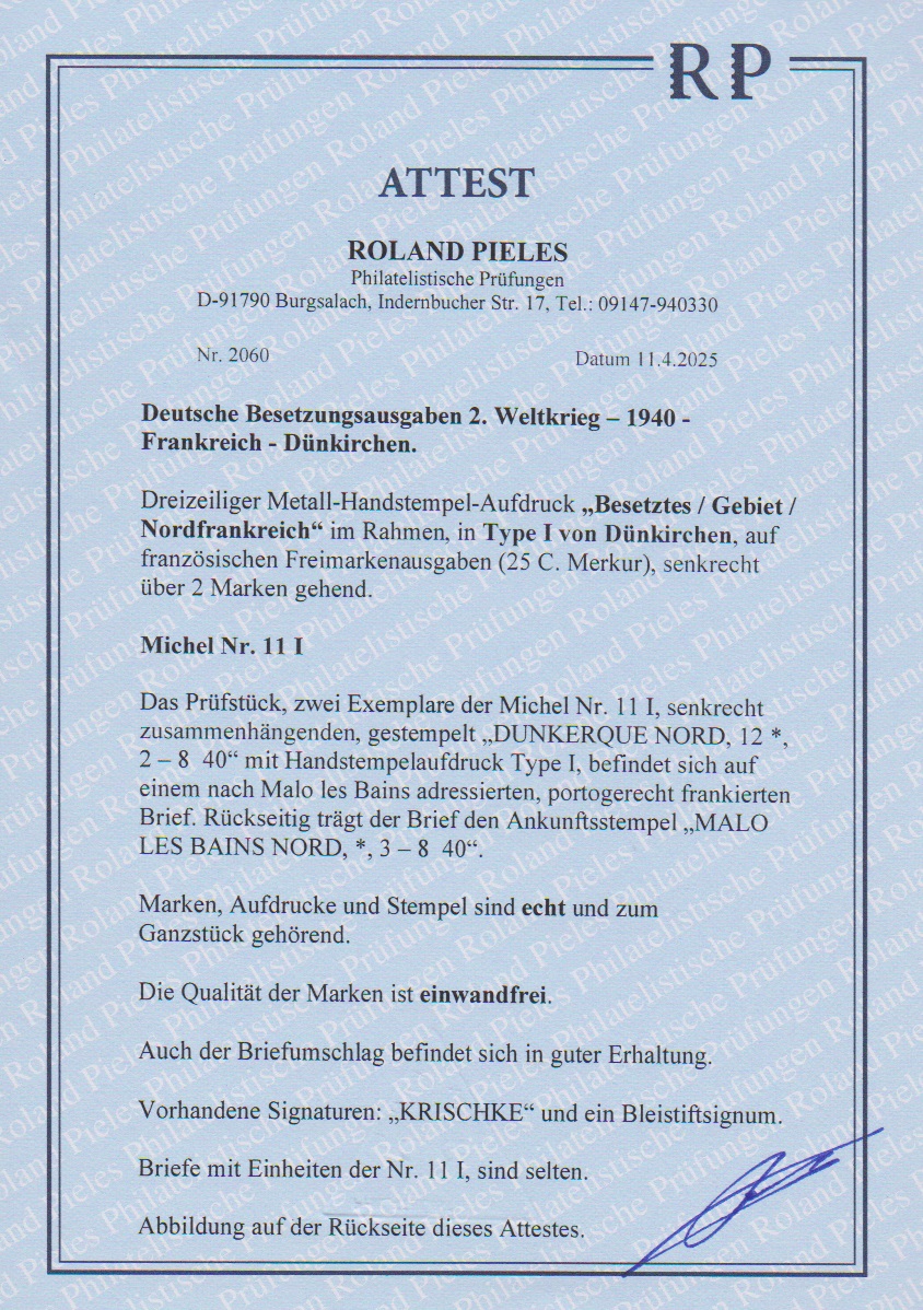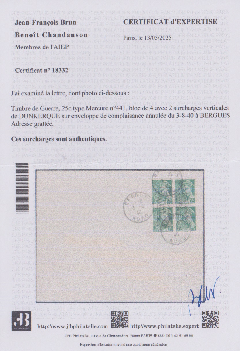 Dünkirchen 25 C. Merkur im Viererblock mit zwei Paaren mit leicht diagonal abgeschlagenen Handstempelaufdrucken in Type I auf portogerechtem Brief aus Dünkirchen, 2.8.1940. Als Mehrfach-Frankatur nicht häufig! Sign. Krischke und Attest Pieles. Mi. 1700,-
