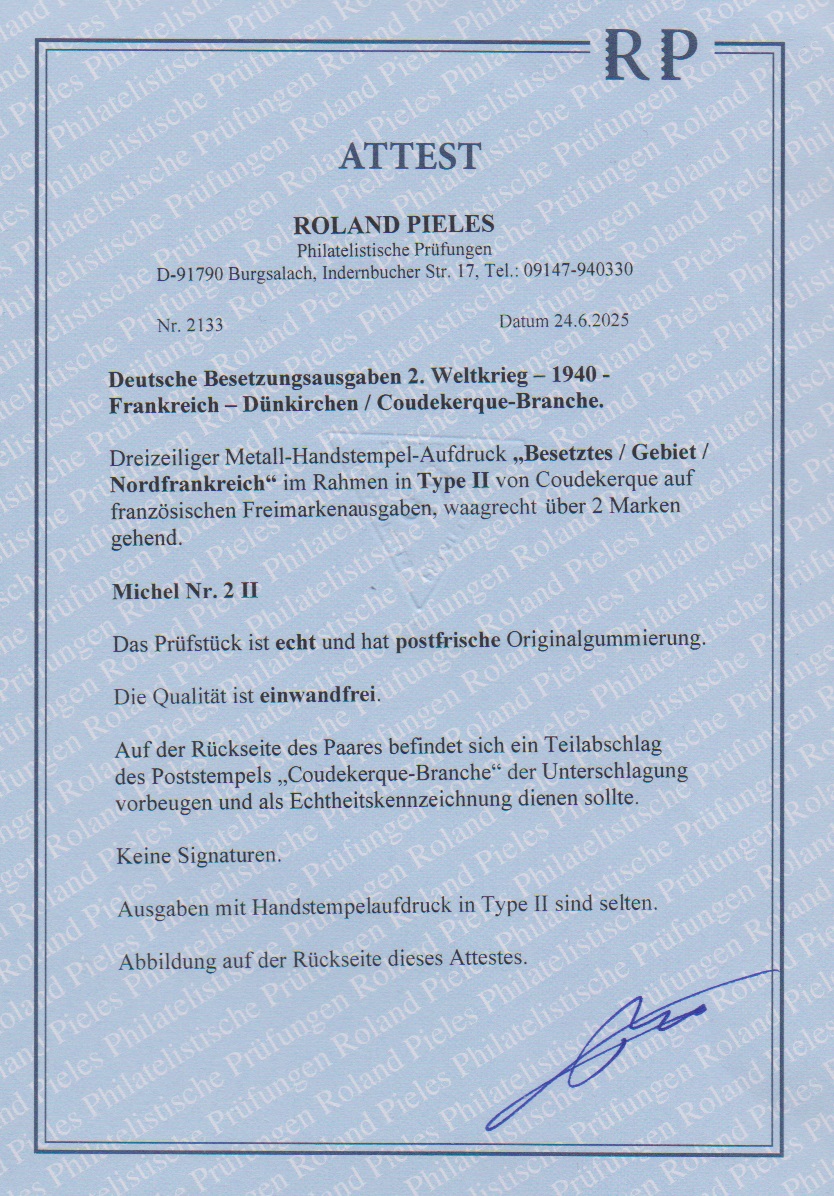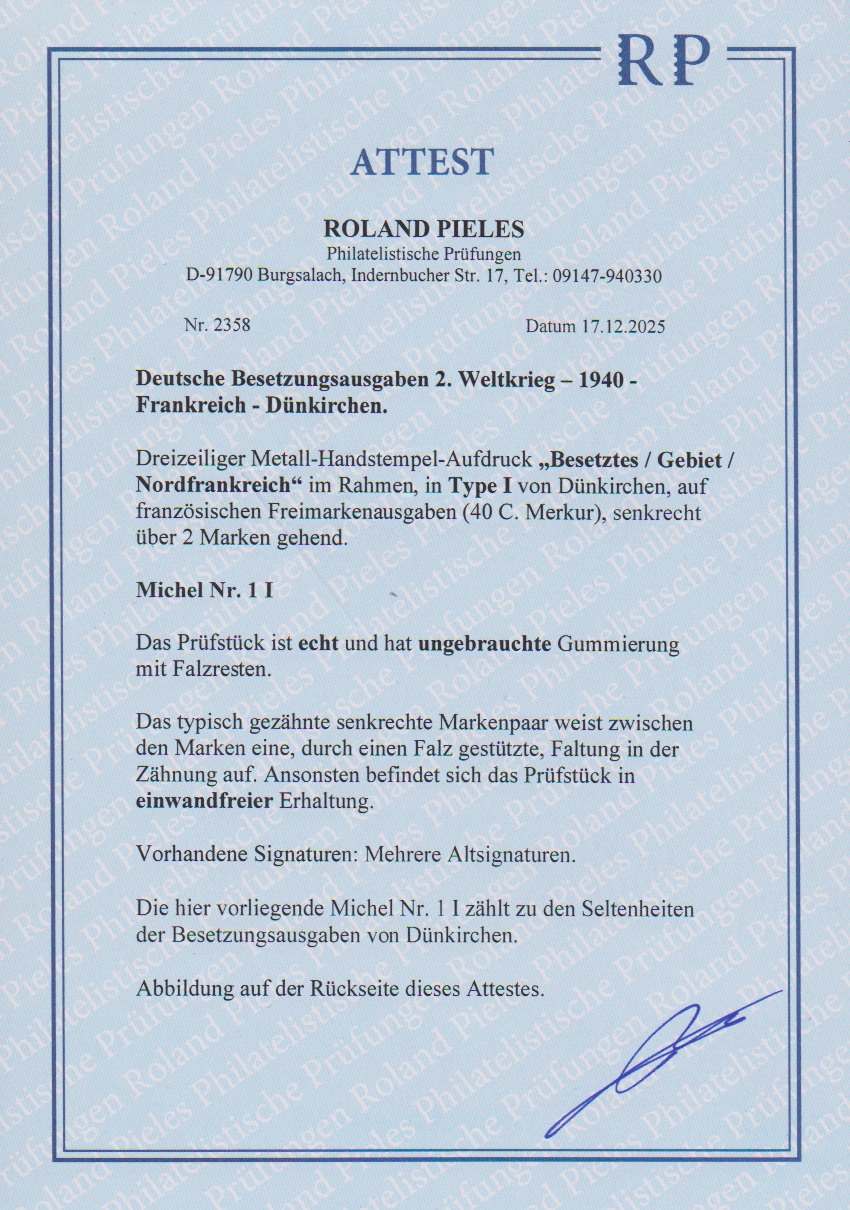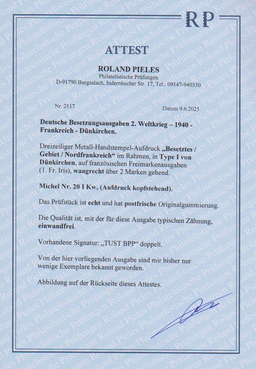 Dünkirchen 1 Fr. Iris im Paar mit kopfstehendem Handstempelaufdruck in Type I tadellos postfrisch, eine sehr seltene Marke, von der "bisher nur wenige Exemplare bekannt geworden" sind, wie auch das Attest Pieles bestätigt. Ferner sign. Tust. Mi. 4000,-