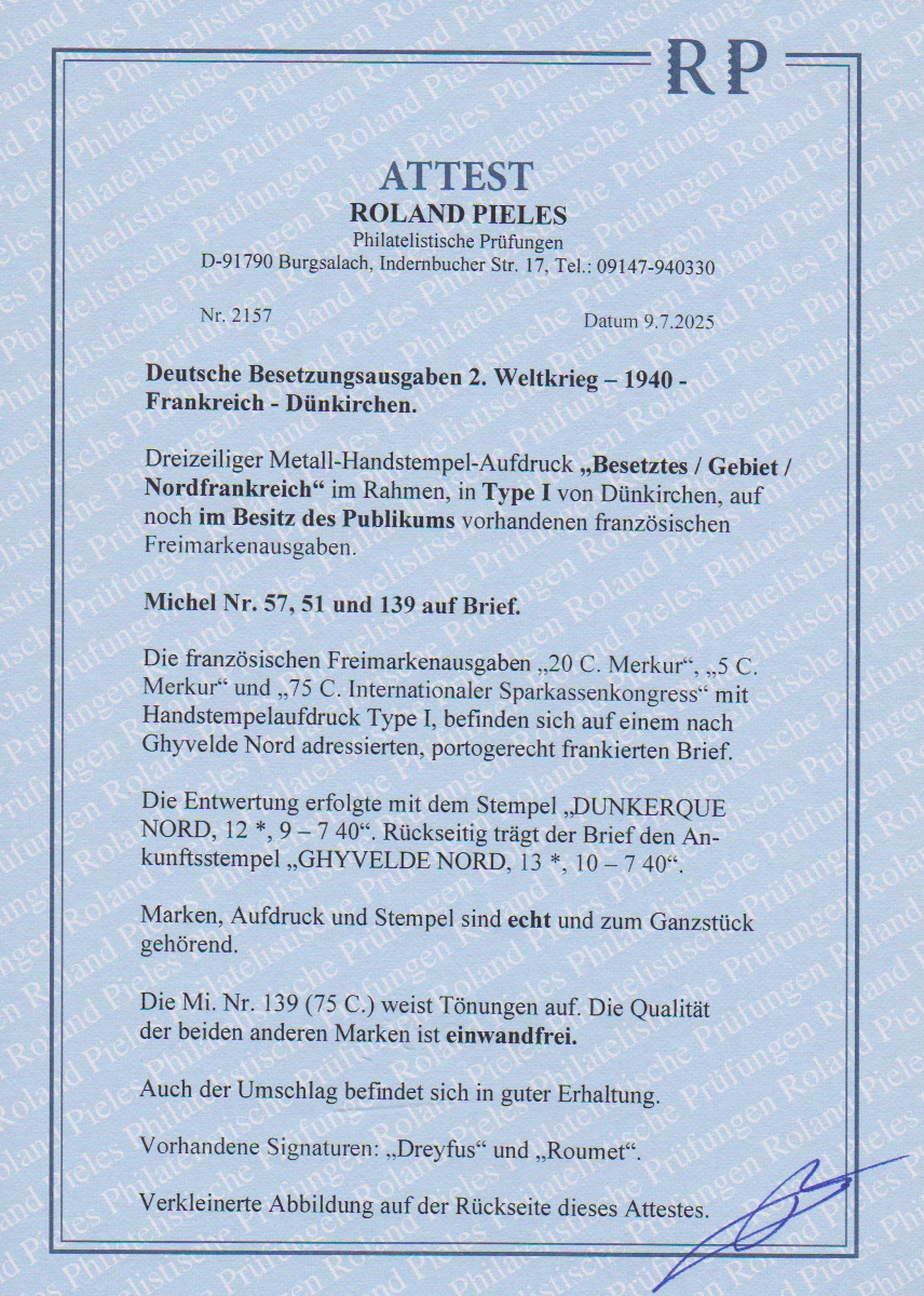 Dünkirchen 5 und 20 C. Merkur, nebst 75 C. "Internationaler Sparkassenkongreß" (leichte Tönung herstellungsbedingt durch die Gummierung), Handstempelaufdruck in Type I auf noch in Gebrauch des Publikums befindlichen Freimarken, auf portogerechtem Brief von Dünkirchen, 9.7.40, nach Ghyvelde. Sign. Dreyfus, Roumet und Attest Pieles. Mi. 1500,-
