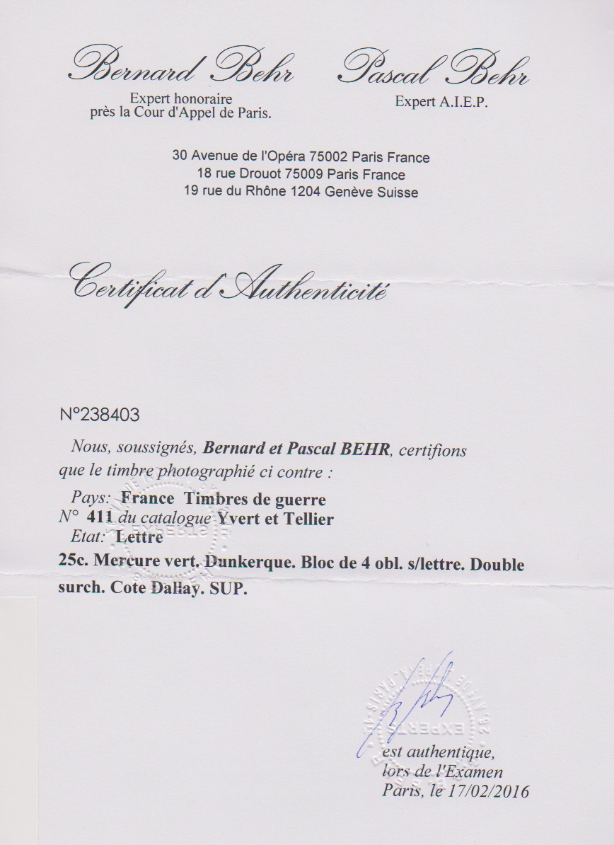 Dünkirchen 25 C. Merkur im Viererblock auf Briefstück, linkes Paar einen senkrechten Handstempelaufdruck in Type I, das rechte Paar mit doppeltem Handstempelaufdruck (Michel unbekannt, Normalmarken schon 1400,- Michel). Atteste Behr, Brun und Pieles "einwandfrei ... bisher einzig bekannt gewordenes Exemplar."