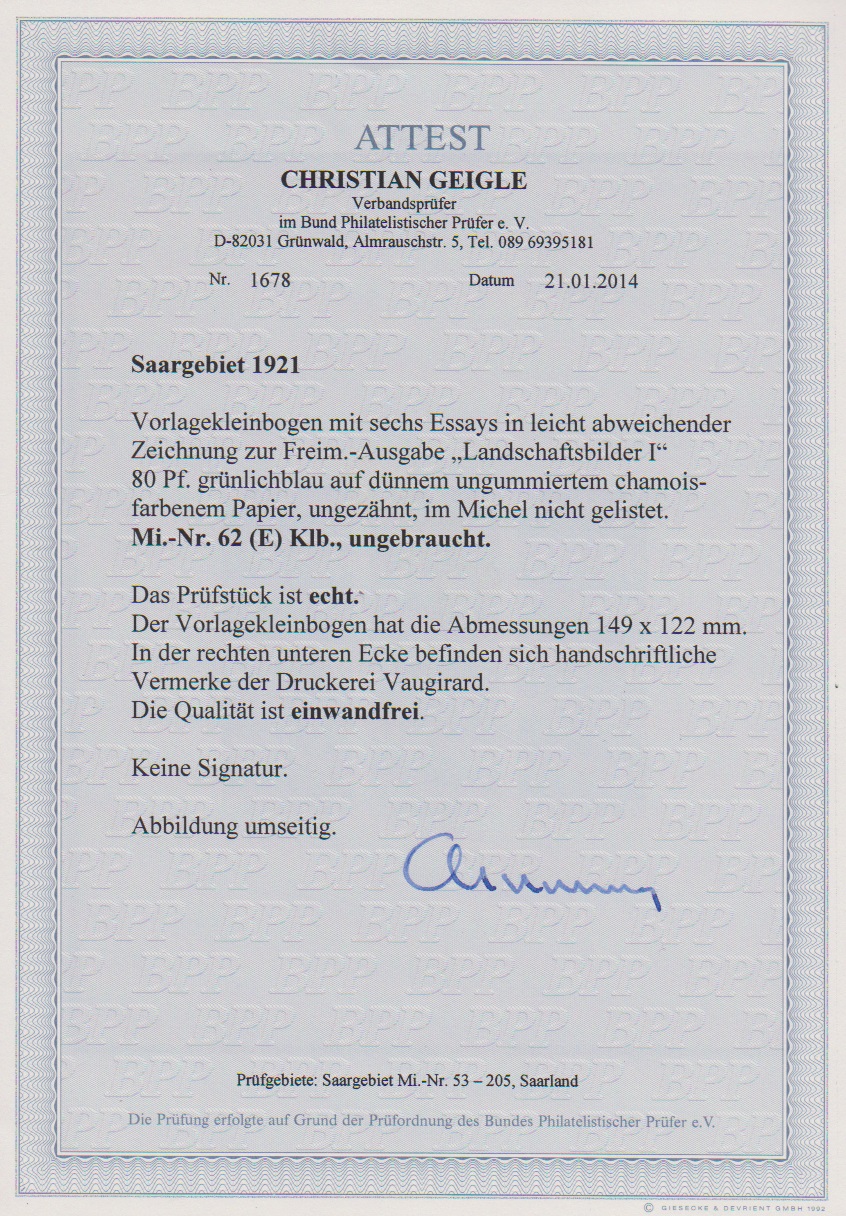 80 Pfg. Landschaftsbilder in grünlichblau, Essay in leicht abweichender Zeichnung auf dünnem, ungummiertem Papier im kompletten Kleinbogen zu sechs Marken mit handschriftlichem Drucker-Vermerk. So selten, Attest Geigle