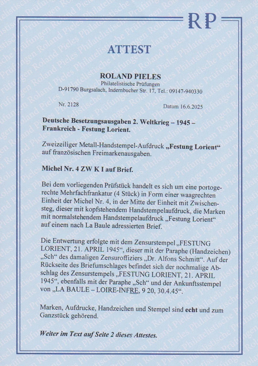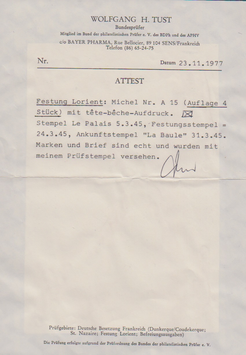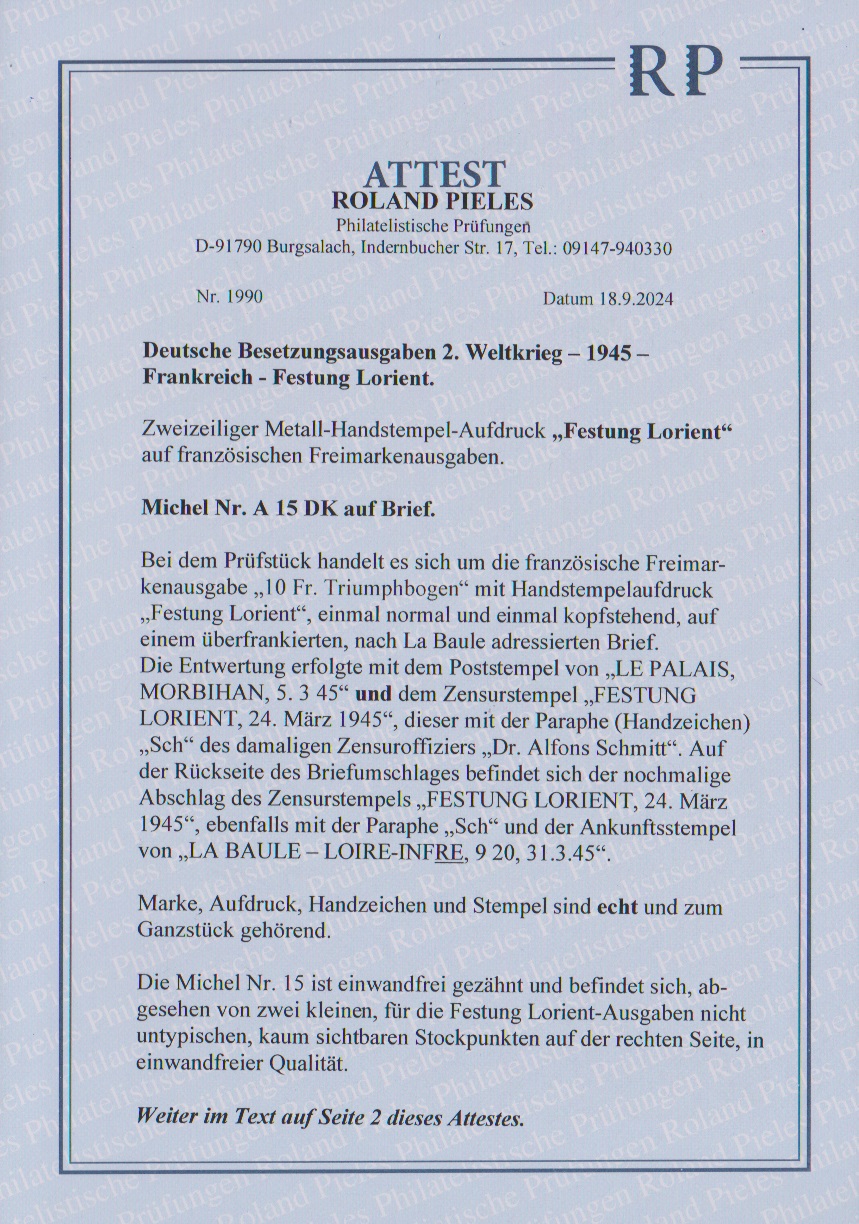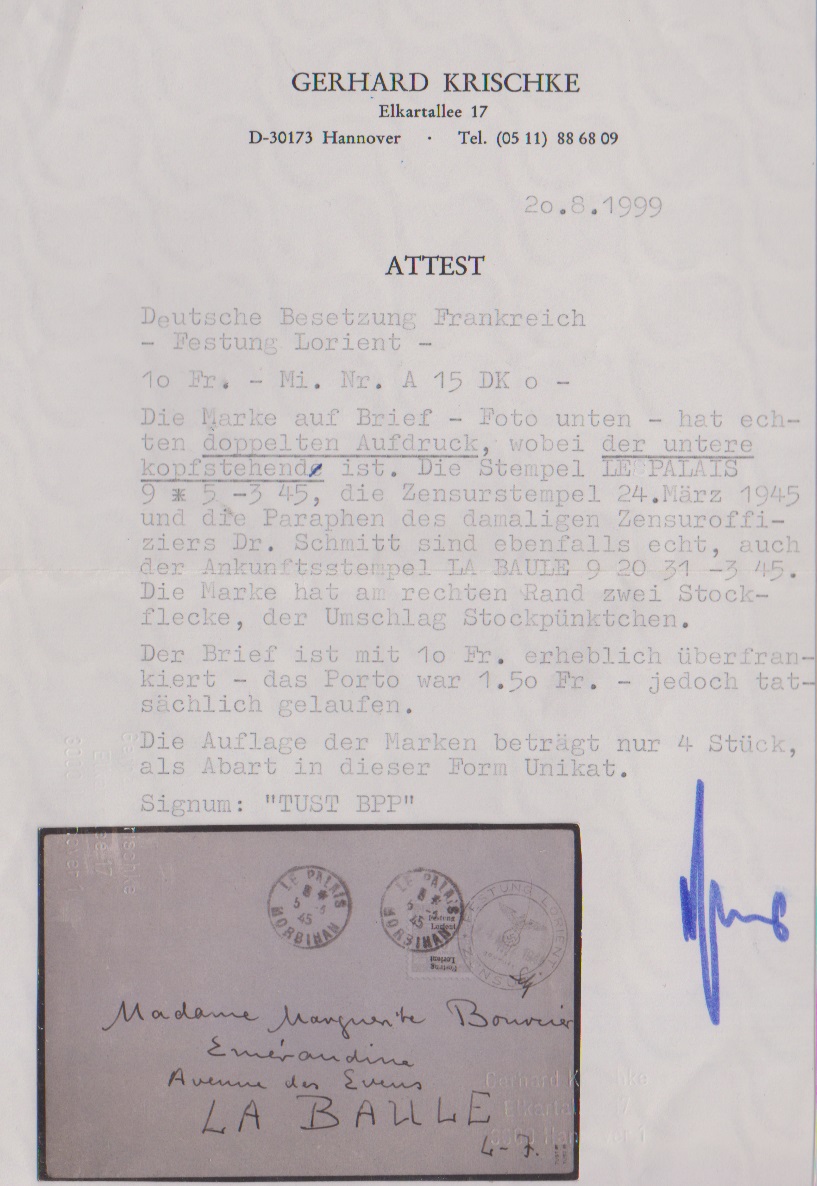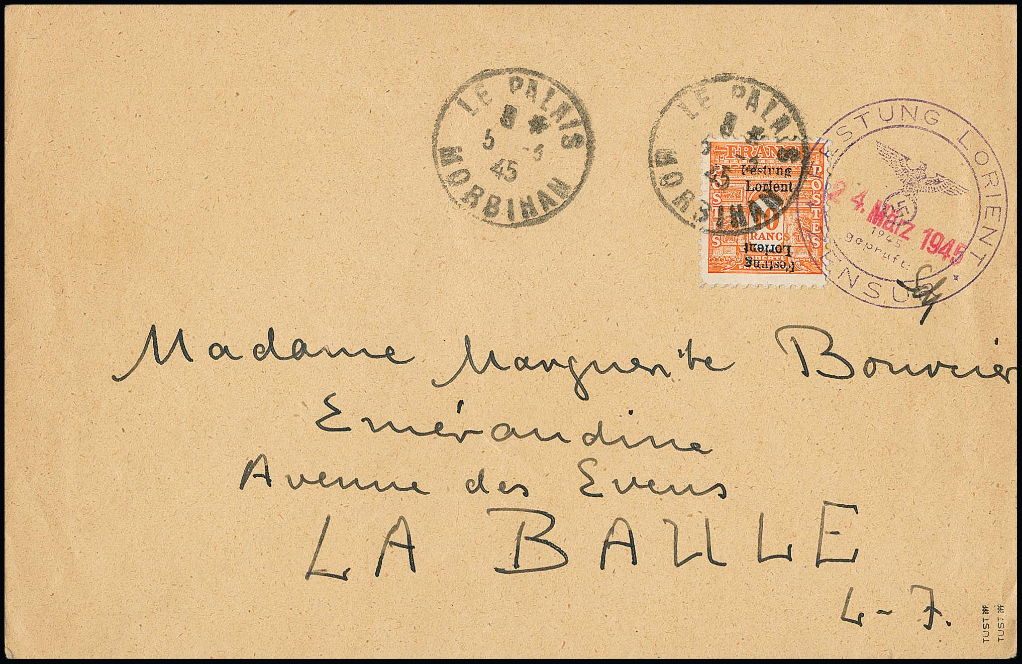 Festung Lorient, 10 Fr. orange, Triumphbogen, der Höchstwert mit doppeltem Handstempel-Aufdruck, der zweite unten kopfstehend, auf Couvert von Le Palais, 5.3.1945, nach La Baule adressiert mit auf die Marke übergehendem Zensurstempel vom 24.5.1945 aus der Festung und handschriftlicher Paraphe "Sch" des Zensur-Offiziers Dr. Alfons Schmitt. Die Marke zeigt rechts am Rand zwei leichte getönte Zahnspitzen, die in Anbetracht der Gummierung für diese Ausgabe als typisch anzusehen sind. Der von Festung zu Festung (Le Palais/Lorient nach La Baule/Nazaire) gelaufene, typisch überfrankierte Brief wurde auf dem Seeweg befördert, da der Landweg nicht mehr möglich war. Es handelt sich bei dem vorliegenden Stück um eine der größten Raritäten der Besetzungs-Ausgaben des zweiten Weltkrieges und von Deutschland überhaupt. Die Auflage dieser Marke betrug laut Michel vier (!) Exemplare, das vorliegende Stück ist das fünfte und einzige mit kopfstehendem Aufdruck, Unikat! Atteste Tust (1977), Krischke (1999) und Pieles (2024). Der Michel-Katalog bewertet das vorliegende Unikat "vorsichtshalber" mit 30.000,- Euro, obwohl noch nie am Markt verkauft!