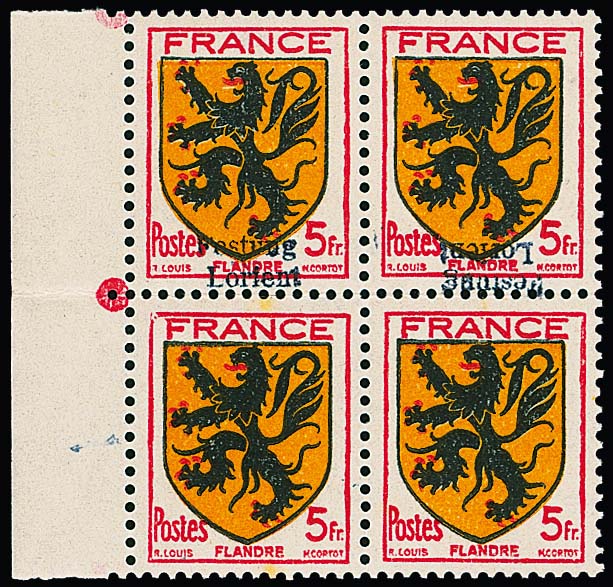 Lorient 5 Fr. Triumphbogen im postfrischen Rand-Viererblock, dabei je die obere Marke mit Aufdruck, die untere ohne Aufdruck, darin das rechte Paar auch noch mit kopfstehendem Aufdruck bei der oberen Marke. Die beiden Aufdruckmarken sind tadellos, die Marken ohne Aufdruck unten mit geringer Gummitönung, in dieser Form wahrscheinlich Unikat (Michel für zwei Paare 14F schon 22.000,-, das Paar 14KF jedoch im Michel unbekannt. Nur die beiden Aufdruckmarken lose werten schon ebenfalls 12.000,- Mi.!). Sign. Tust und Attest Pieles