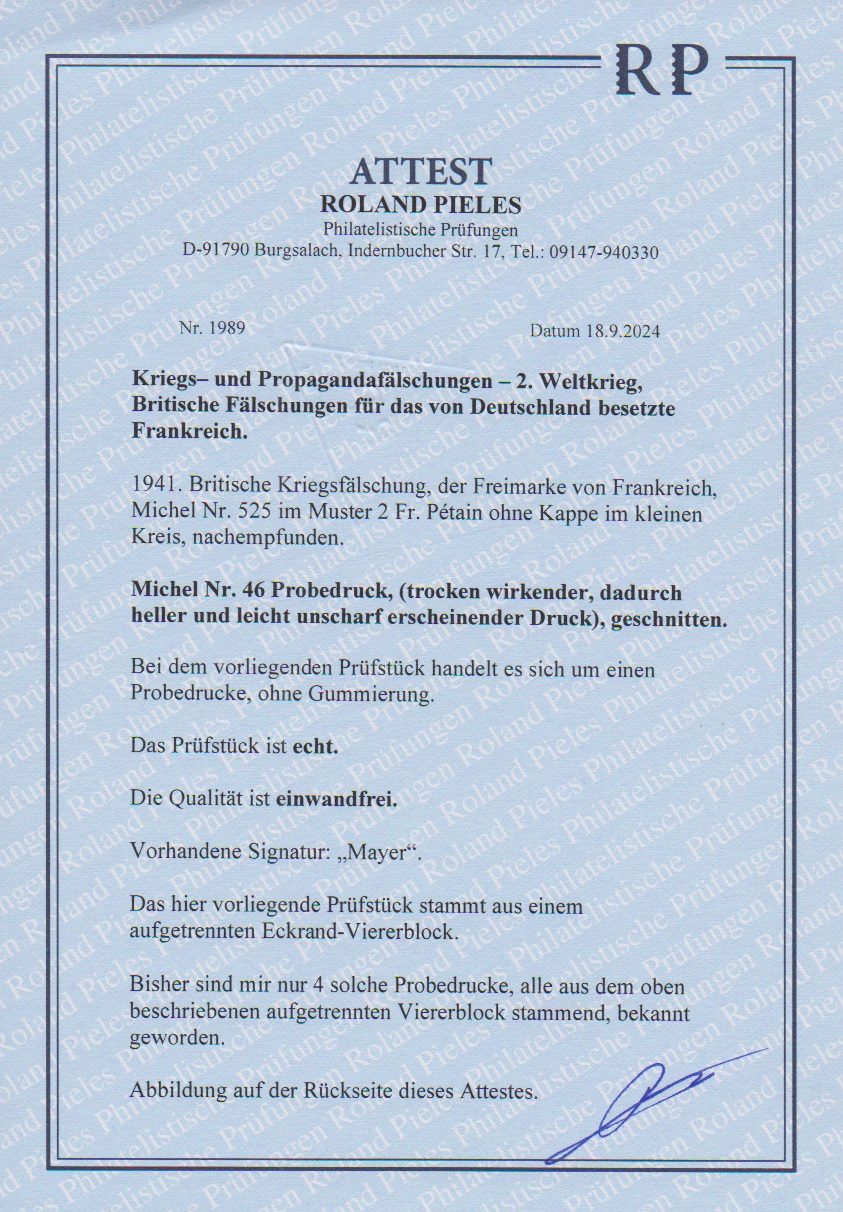 Britische Fälschungen für das von Deutschland besetzte Frankreich, 2 Fr. grün, Petain, trockener Druck, geschnittener Probedruck in tadelloser Erhaltung. Bisher sind nur vier solcher Probedrucke bekannt, die - wie das vorliegende Stück - aus einem aufgetrennten Eckrand-Viererblock stammen. Im Michel nicht gelistet und große Seltenheit der Kriegspropaganda-Ausgaben. Sign. Mayer und Attest Pieles