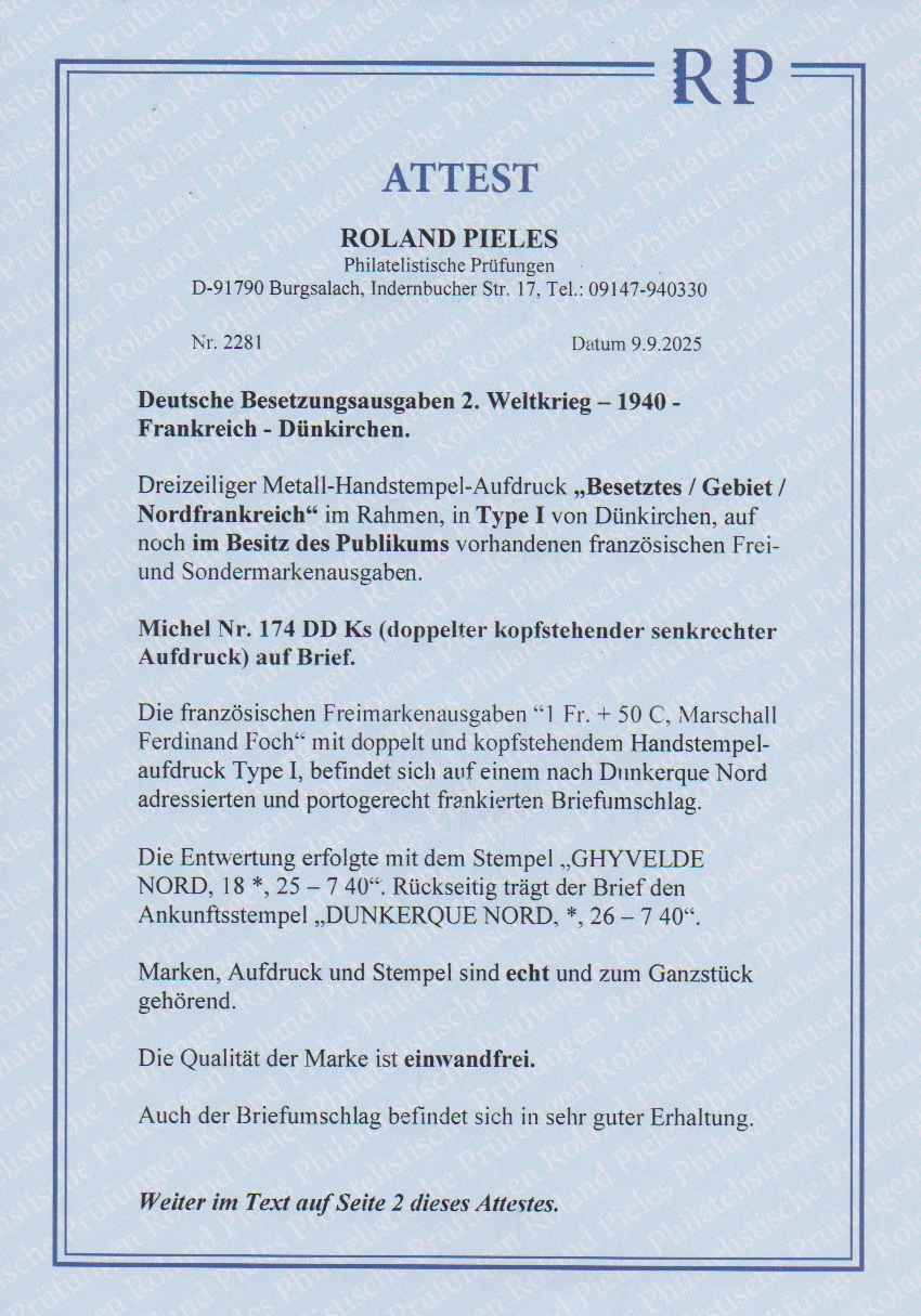 Dünkirchen 1 Fr. + 50 C., Marschall Foch, mit doppeltem kopfstehendem Handstempelaufdruck in Type I auf portogerechtem Couvert aus Ghyvelde, 25.7.40. Auf Ganzstück eine sehr seltene Besonderheit, nur wenige Exemplare bekannt. Sign. Roumet, Dreyfus und Attest Pieles. Mi. 2000,-