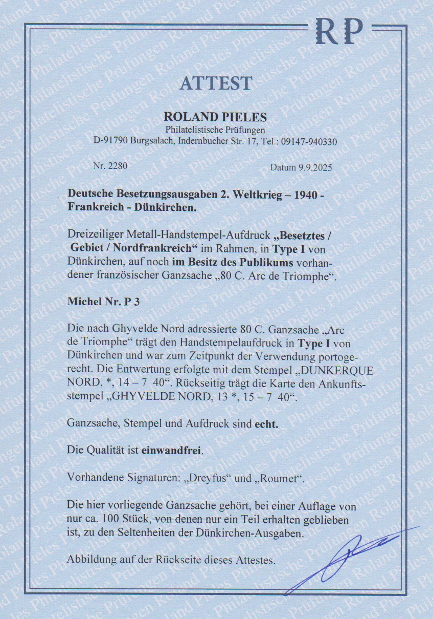 Dünkirchen, Ganzsachenkarte 80 C. "Arc de Triomphe" mit Handstempel in Type I portogerecht adressiert von Dünkirchen, 14.7.1940, nach Ghyvelde. Diese Ganzsachenkarte ist zur Aufnahme in den Michel vorgesehen, aber bisher noch nicht katalogisiert, weil nur wenige Exemplare vorgelegen haben und man von einer Ursprungsauflage von nur 100 Exemplaren ausgeht, von denen wiederum nur ein Teil erhalten geblieben ist. Sign. Dreyfus, Roumet und Attest Pieles "einwandfrei ... Seltenheit der Dünkirchen-Ausgaben"