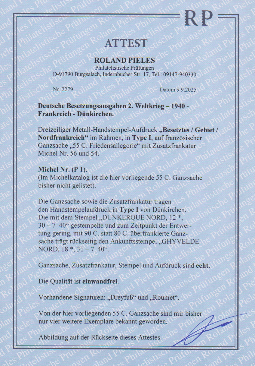 Dünkirchen, Ganzsachenkarte 55 C. Allegorie, mit Zusatzfrankatur 15 u. 20 C. (Nr. 54 u. 56), mit Handstempel in Type I, von Dünkirchen, 30.7.1940, adressiert nach Ghyvelde. Diese Ganzsachenkarte ist zur Aufnahme in den Michel vorgesehen, aber bisher noch nicht katalogisiert, weil nur wenige Exemplare bisher vorgelegen haben. Insgesamt sind nur fünf Exemplare dieser Ganzsachenkarte bekannt, die somit zu den Seltenheiten des Sammelgebietes gehört. Sign. Dreyfus, Roumet und Attest Pieles "einwandfrei"