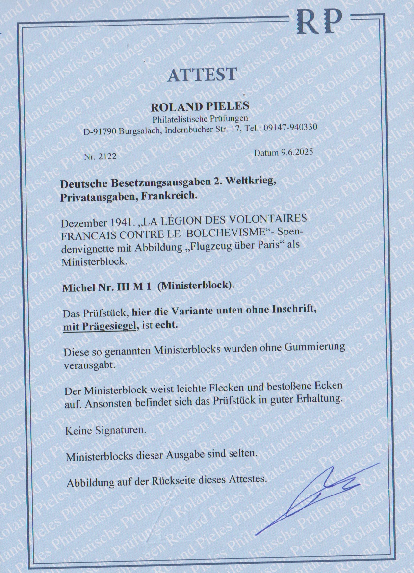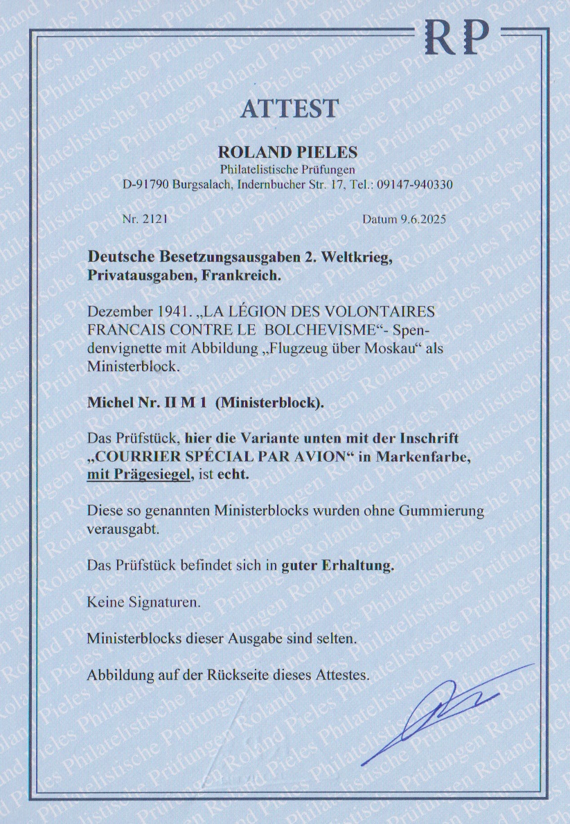 Legionsausgaben, Flugpostvignetten je im Ministerblock-Einzelabzug auf Büttenkarton, Nr. II in der Variante mit Inschrift "COURRIER SPÉCIAL PAR AVION" in Markenfarbe (sehr selten!), Nr. III ohne Inschrift, beide mit Prägesiegel, letzterer typisch leicht bestoßene Eckchen und kleine Randfleckchen. Diese Ministerblocks wurden nur in einer kleinen Auflage hergestellt und sind sehr selten! Atteste Pieles