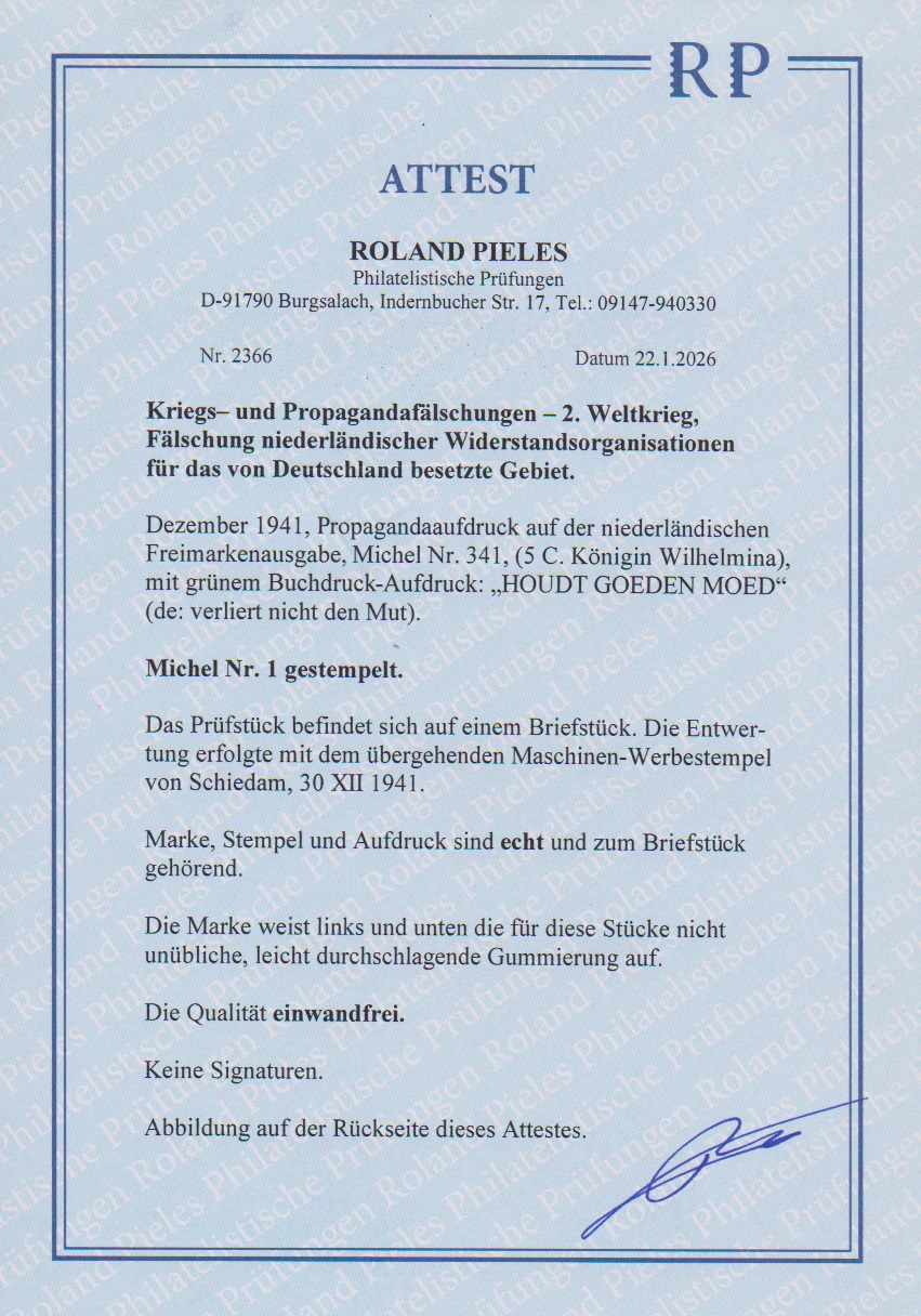 Fälschungen Niederländischer Widerstandsorganisationen für das von Deutschland besetzte Gebiet, 5 C. Wilhelmina mit Aufdruck "Houdt Goeden Moed" auf Briefstück. Sehr seltene, im Michel nur mit "-.-" bewertete Fälschung. Attest Pieles