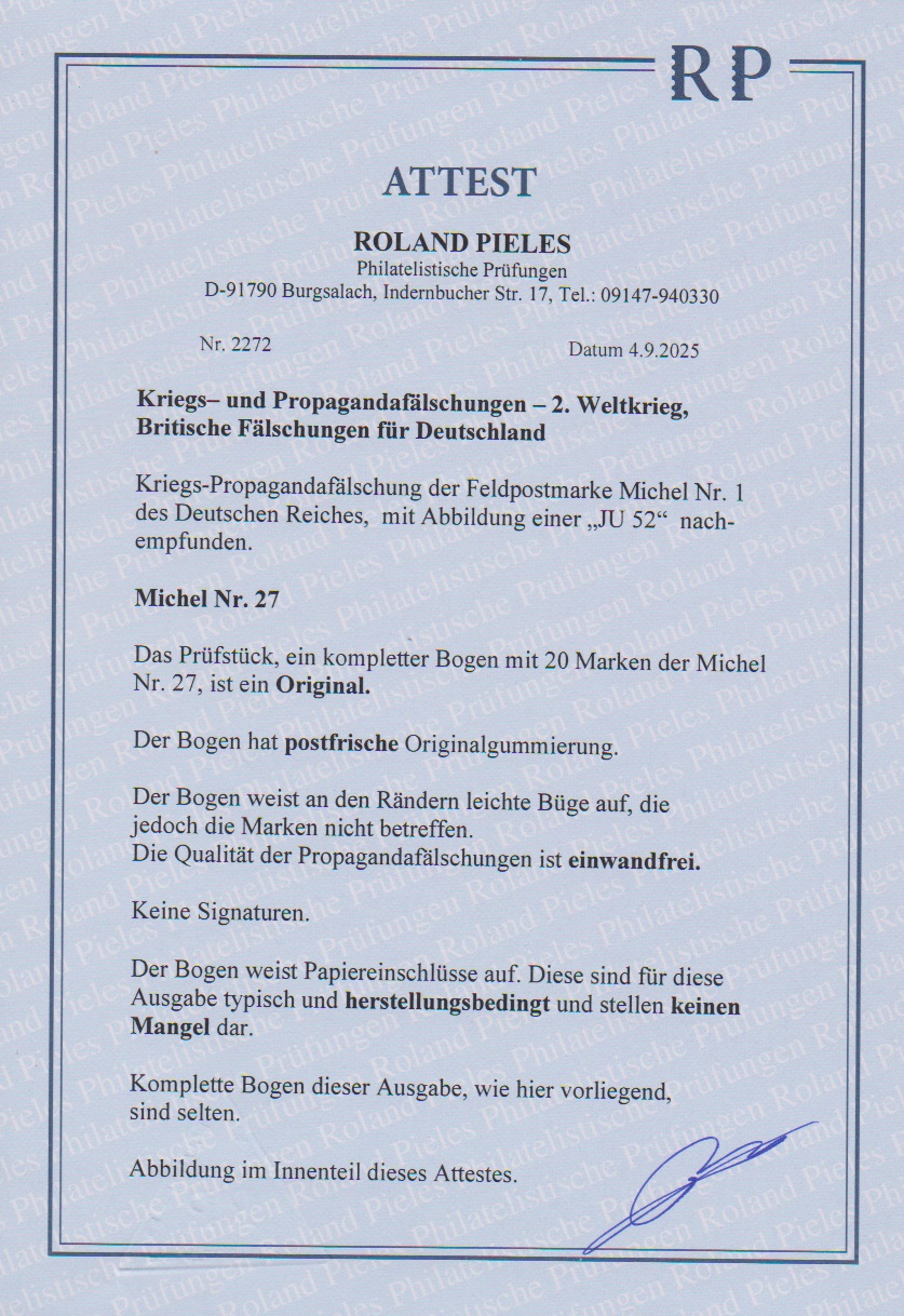 Britische Fälschungen für Deutschland, Kriegspropaganda-Fälschung der Luftpost-Zulassungsmarke im kompletten postfrischen Bogen, nur noch wenige vollständige Bogen existent und selten, wie auch das Attest Pieles bestätigt. Michel der losen Marken 3000,- +