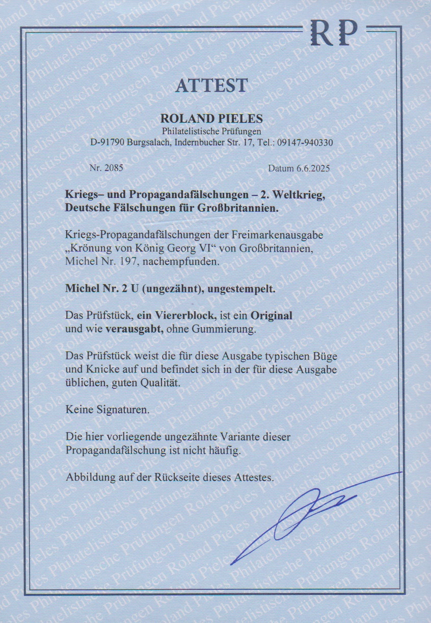 Deutsche Fälschungen für Großbritannien, 1 1/2 P. Georg/Stalin in der seltenen geschnittenen Variante im Viererblock ungebraucht wie verausgabt mit den hierfür typischen Bügen der wenigen gefundenen Restbestände. Als geschnittene Einheit (Mi. lose 2000,-) selten. Attest Pieles