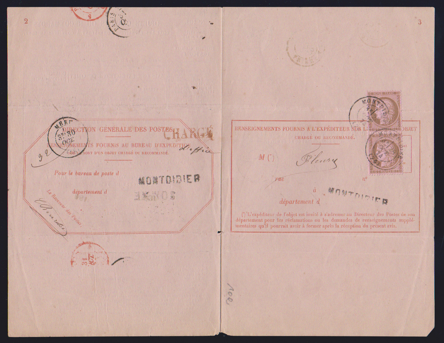 10 C. braun/rosa im Paar auf kpl. Retour-Recepisse aus Montoidier 1874, tadellos (Faltspur nur im Formular)
