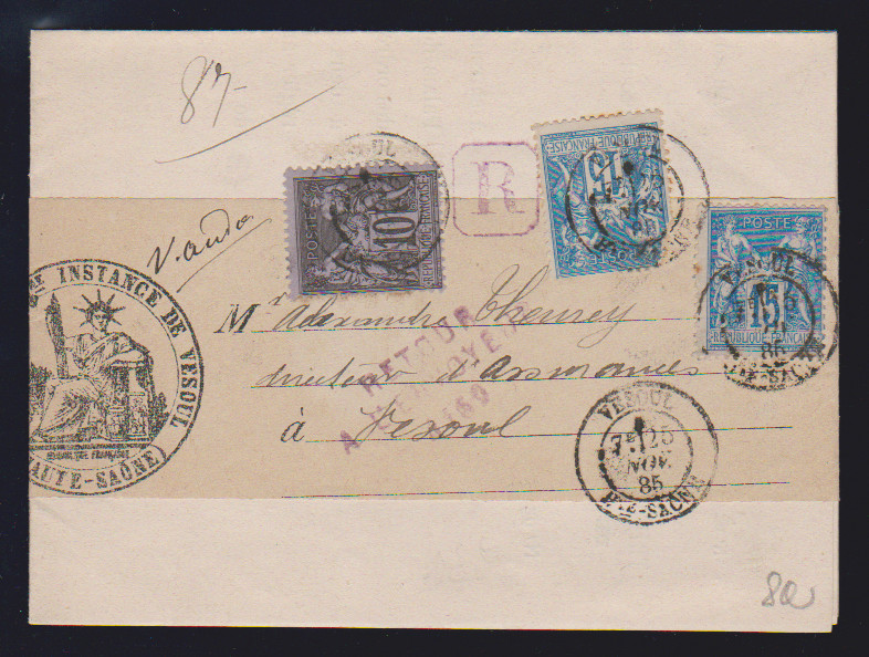 10 C. schw./lila nebst zweimal 15 C. blau (teils Mgl.) auf eingeschriebenem Orts-Streifband (!) aus Vesoul 1885