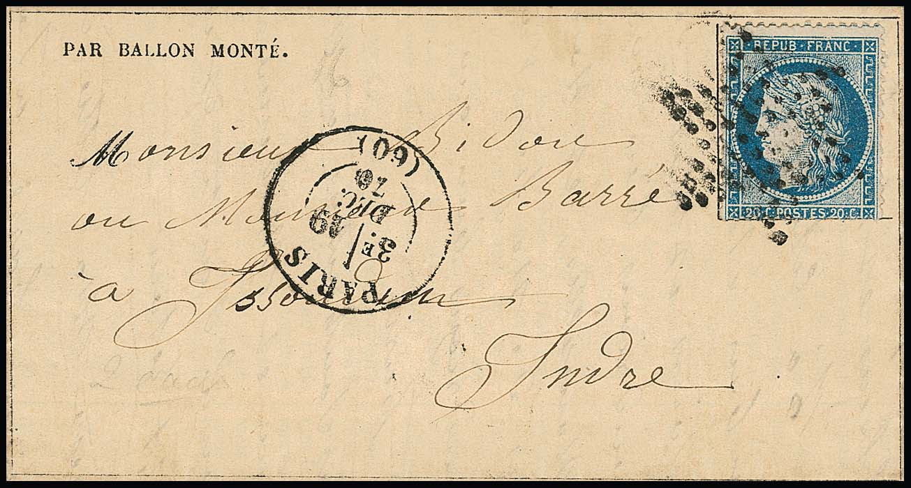 20 C. blau auf Brief "Ballon Monte" aus Paris, Ballon "Le Lavoisier", innen "Gazette des Absents" vom 14.12.1870