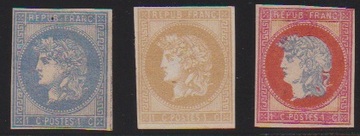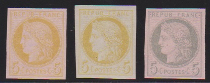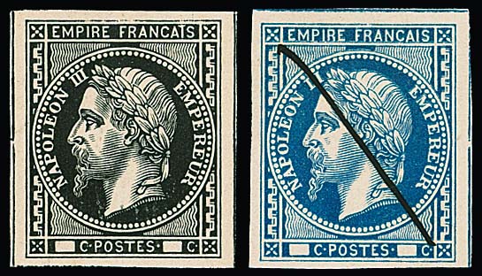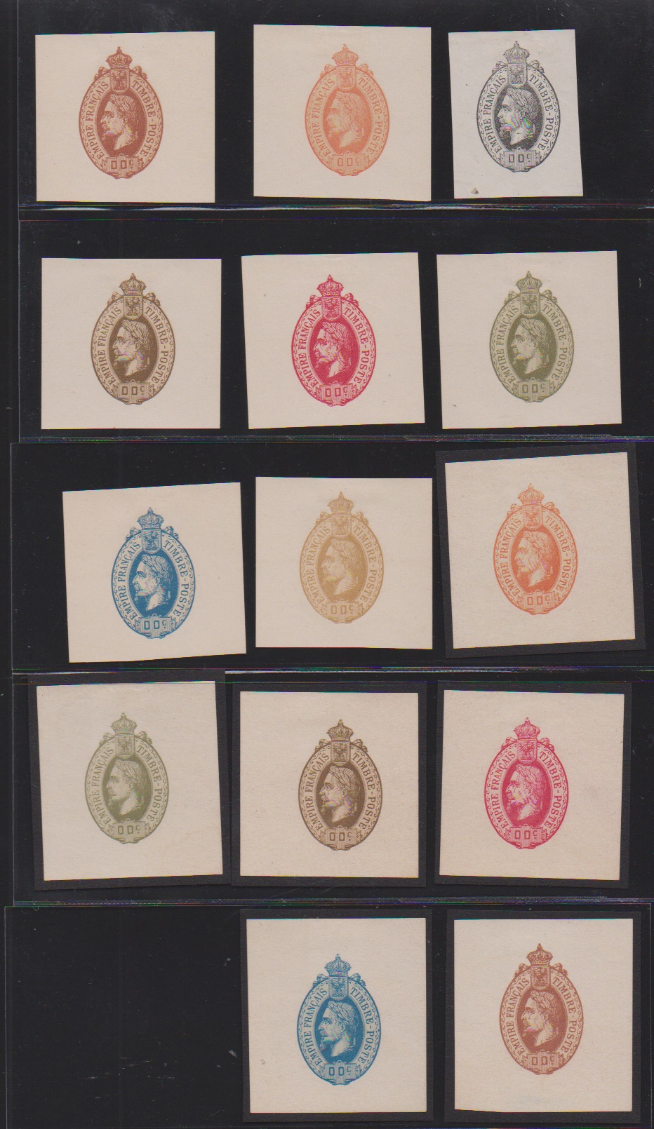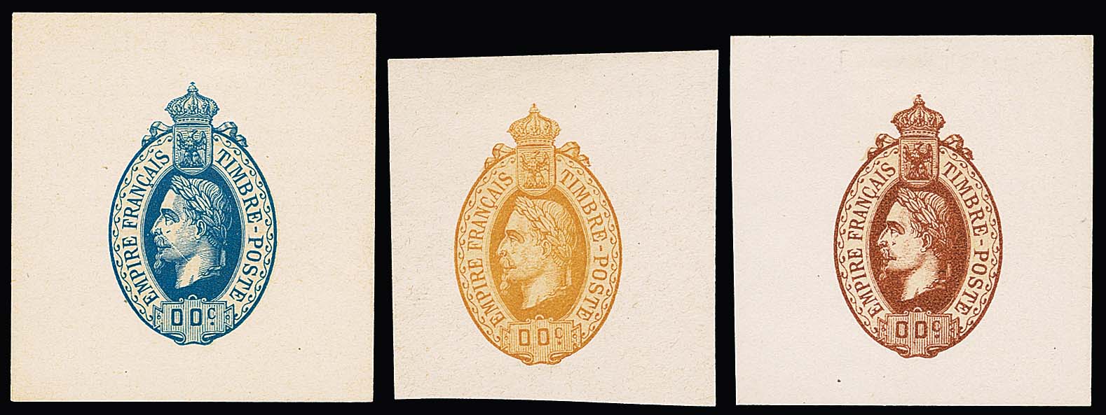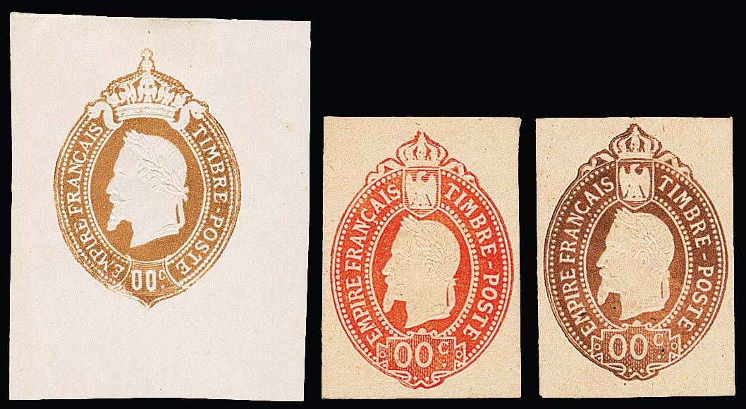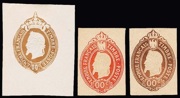 1867, Napoleon III., schwarz, blau, rot, drei geschnittene Essays ohne Wertangabe mit Annullierungsstrichen zu einer nicht verausgabten Freimarkenserie