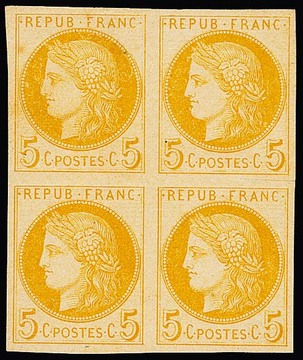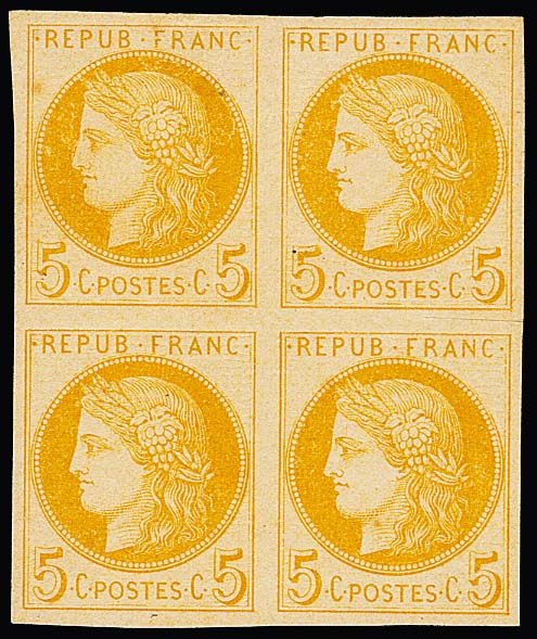 5 C. olivgelb, Ceres, geschnittener Probedruck-Viererblock (kl. Vortrennschnitt nur im Zwischenraum)