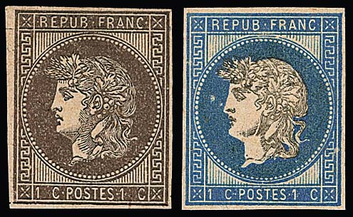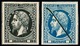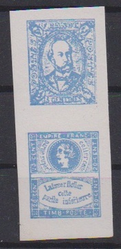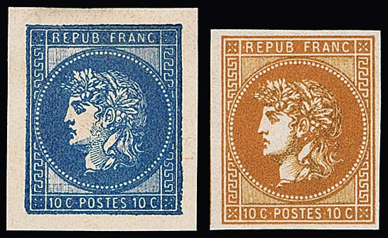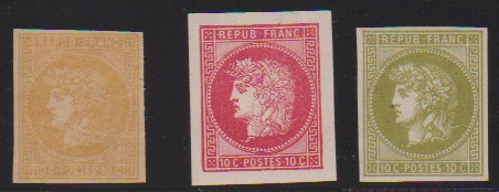 1867, 10 C. rot, orangerot, und 15 C. blau, drei gezähnte Essays zu einer nicht verausgabten Freimarkenserie (übliche Zahnfehler von der prov. Zhg.), sowie ein geschnittenes Essay-Neudruck-Paar
