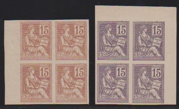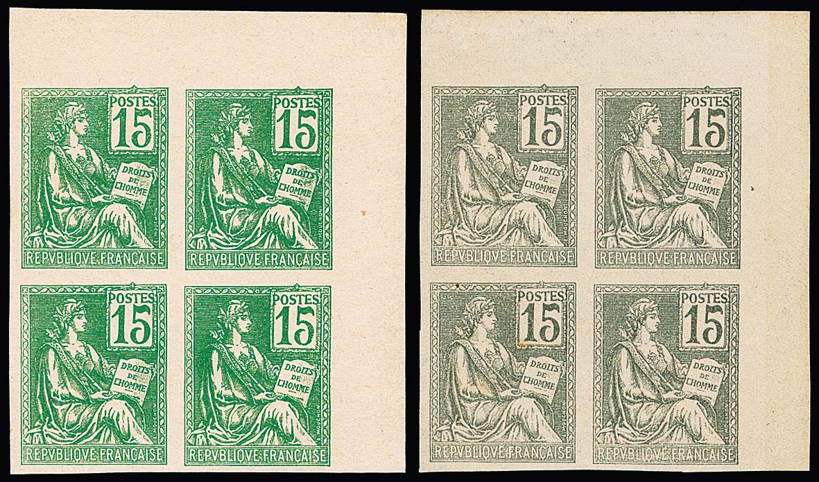 15 C. Allegorie, vier geschnittene Probedruck-Viererblöcke, aus der rechten oberen Bogenecke (grün, grau, purpur) bzw. vom linken Bogenrand (braun)