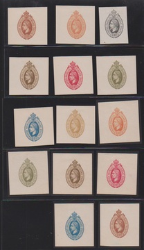 1870 (ca.), 17 verschiedene Essays (einfarbig oder zweifarbig) für eine Ganzsachen-Ausgabe mit Wertangabe "00", Motiv "König, darüber Adler-Wappenschild und Krone"