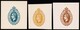 1870 (ca.), drei verschiedene Essays im kombinierten Buch-/Prägedruck für eine Ganzsachen-Ausgabe mit Wertangabe "00", braun mit Motiv "König mit Krone", sowie in braun und rot mit Motiv "König/Adler/Krone"
