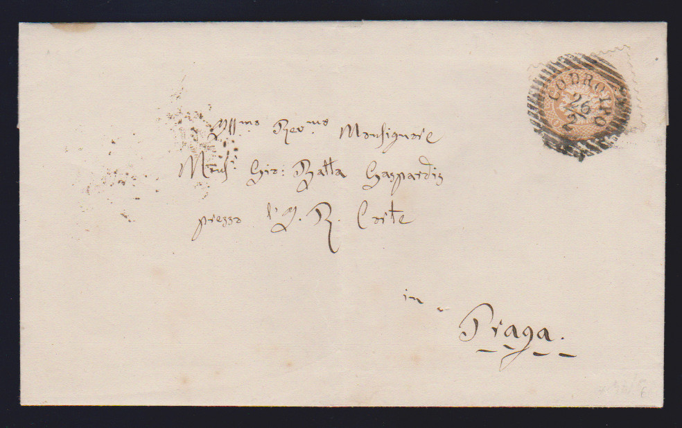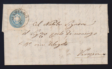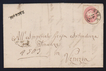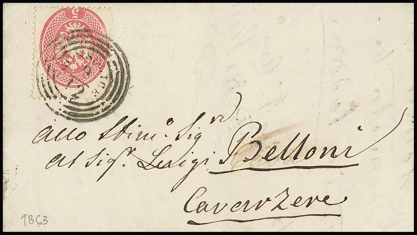 5 Sld. rosa, Kabinettstück auf Briefchen 1863 mit seltenem Vierringstempel "Monselice" (Müller 159b)