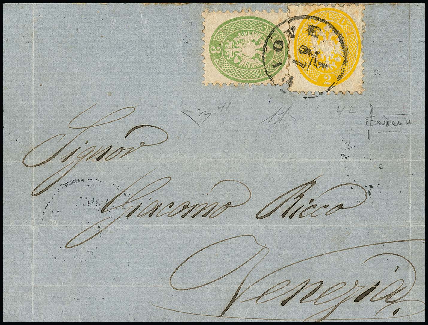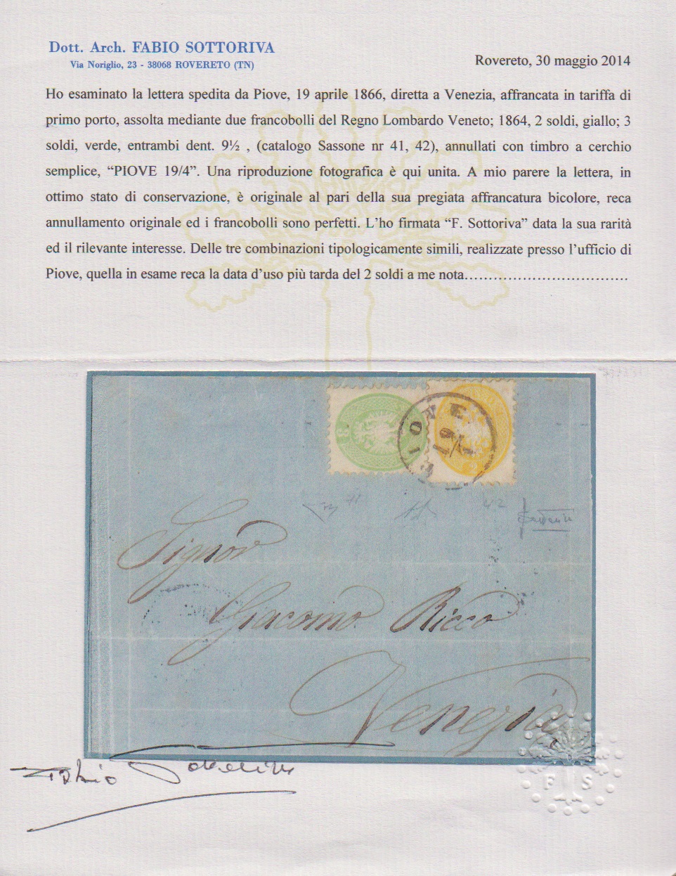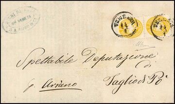 2 Sld. gelb und 3 Sld. gelbgrün, Prachtstücke auf mehrf. gef. Brief mit K1 "Piove" 1866 nach Venezia. Die Nr. 19 ist auf Lombardei-Brief selten, hier in völlig ursprünglicher Gebrauchserhaltung, Atteste Sottoriva, Diena. Mi. 1500,- +