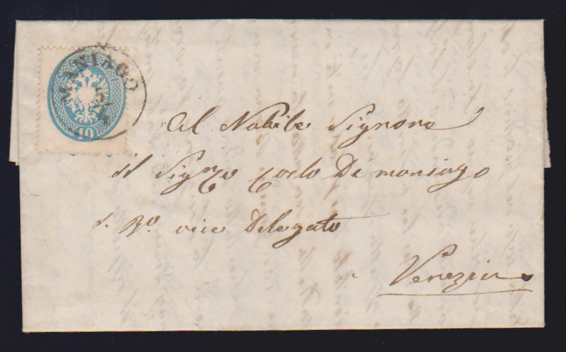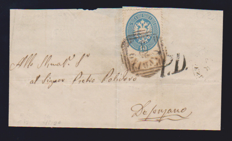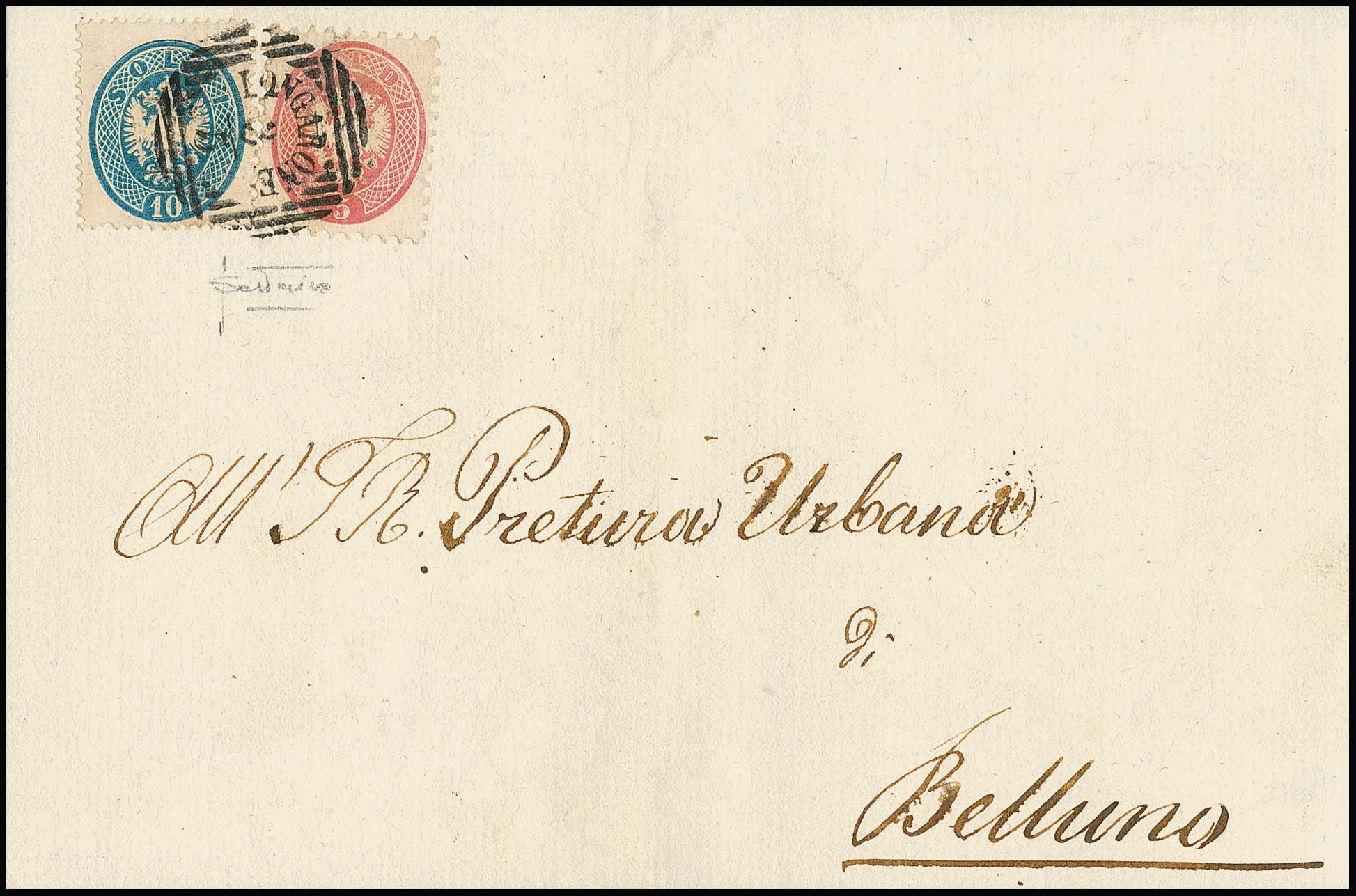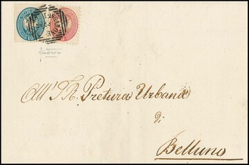 10 Sld. blau in Mischfrankatur mit weit gezähnter 5 Sld. rosa auf sehr sauberem Brief mit seltenem Balken-Einkreiser "Longarone", sign. mit Attest Sottoriva, Müller 131b