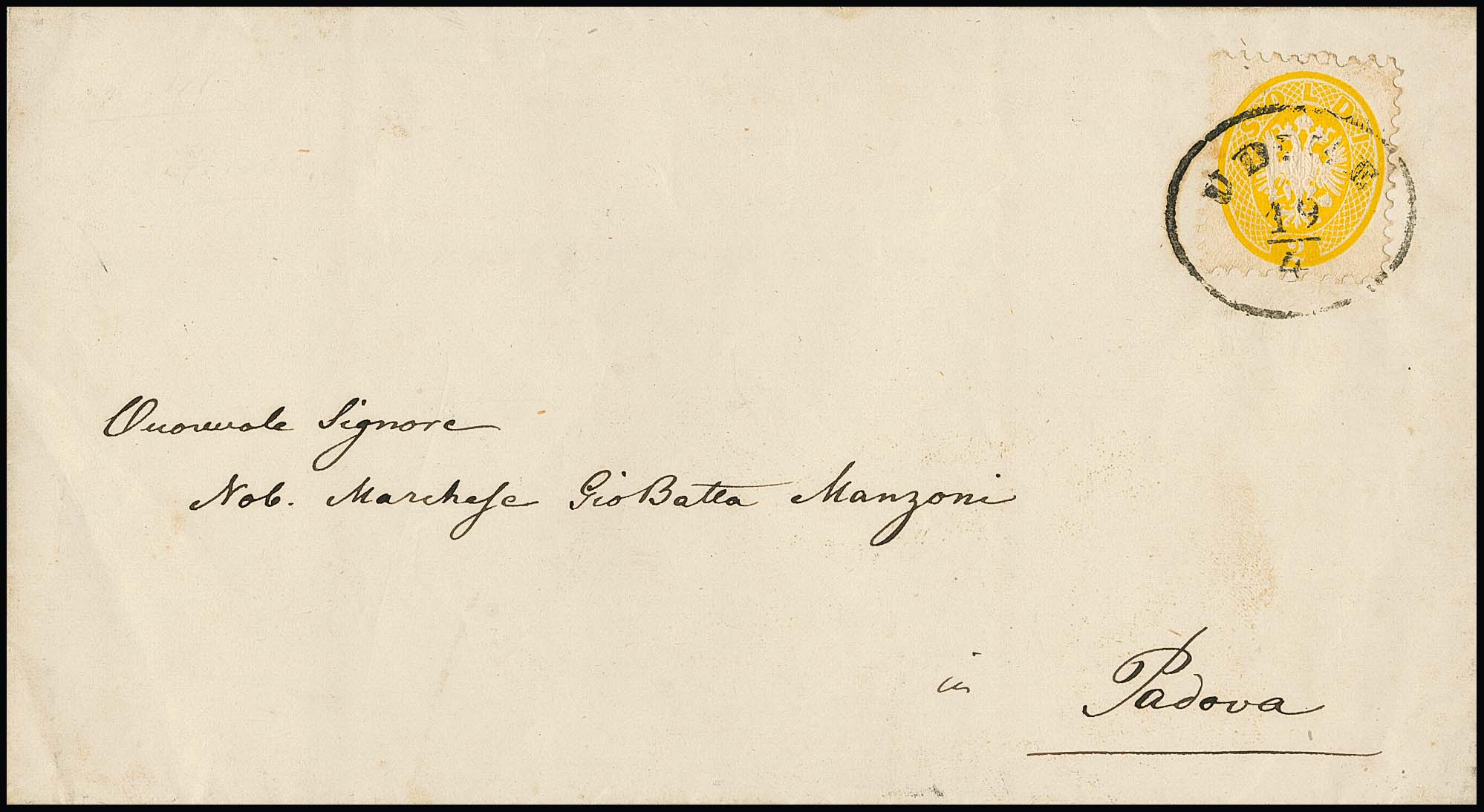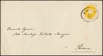 2 Sld. gelb einzeln auf Kabinett-Drucksache mit Ovalstempel "Udine" nach Padua. Seltene Einzelfrankatur, Mi. 1500,-