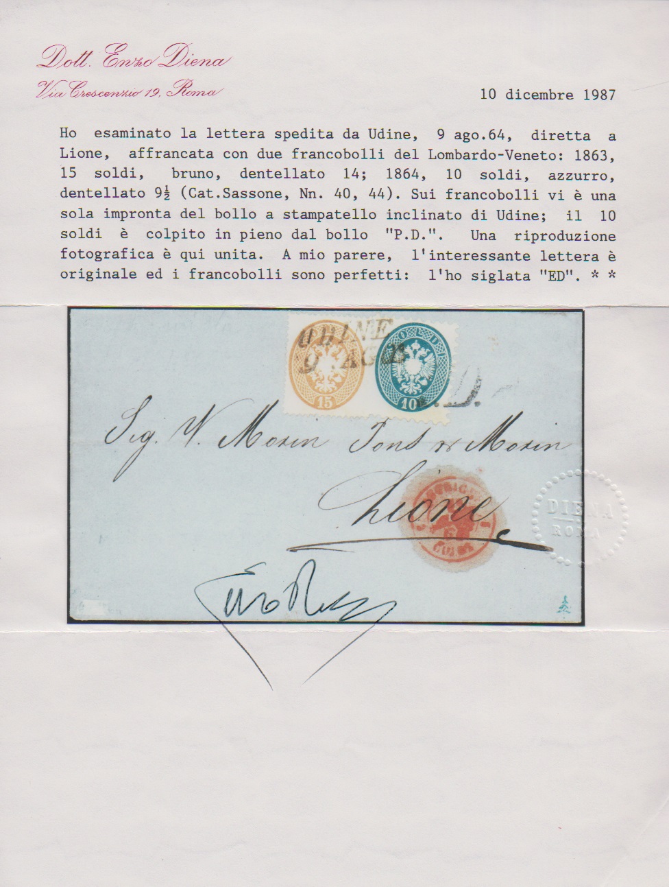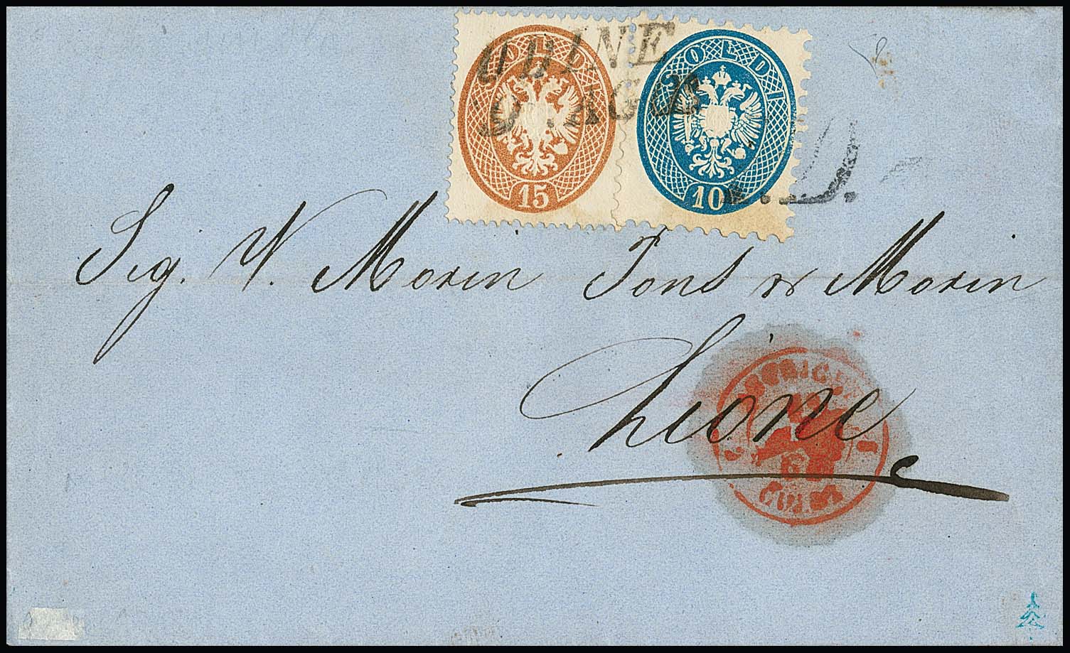 15 Sld. ockerbraun in Mischfrankatur mit weit gezähnter 10 Sld. blau auf Kabinettbrief 1864 mit L2 "Udine" nach Lyon/Frankreich. Ex Provera, Attest Diena