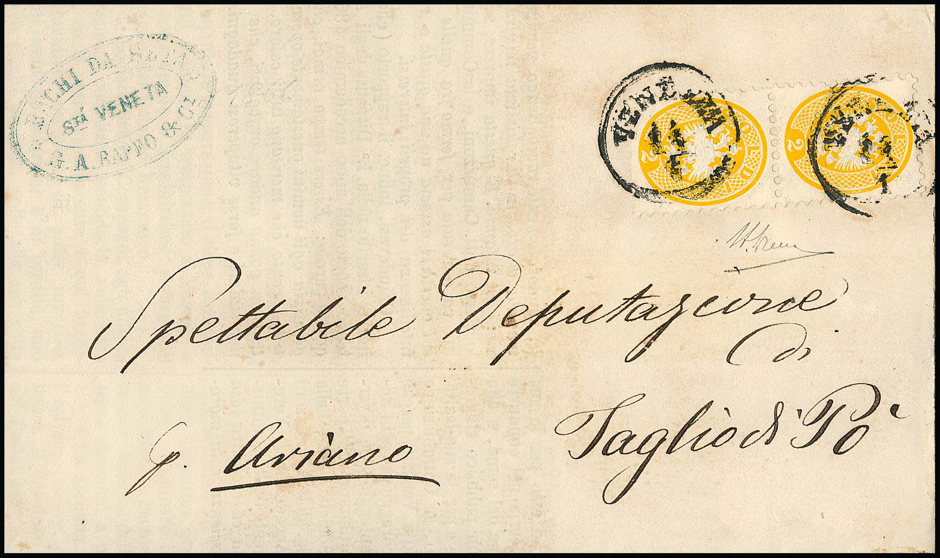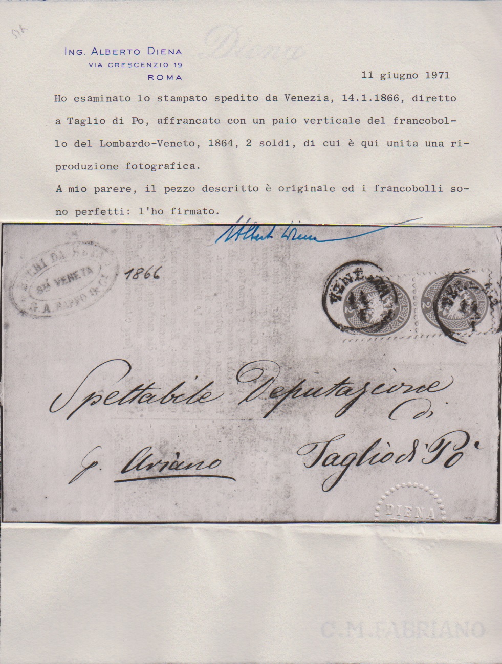 2 Sld. gelb, seltenes senkrechtes Kabinettpaar auf Drucksache (Papier leichte Spuren) von Venezia nach Ariano. Doppelfrankaturen dieser ohnehin schon guten Marke sind sehr selten! Attest Diena. Mi. mind. 2050,- +