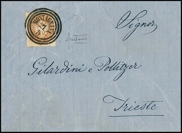 15 Sld. ockerbraun auf Prachtbrief mit sehr klarem Dreiringstempel "Montagnana", sign. Sottoriva