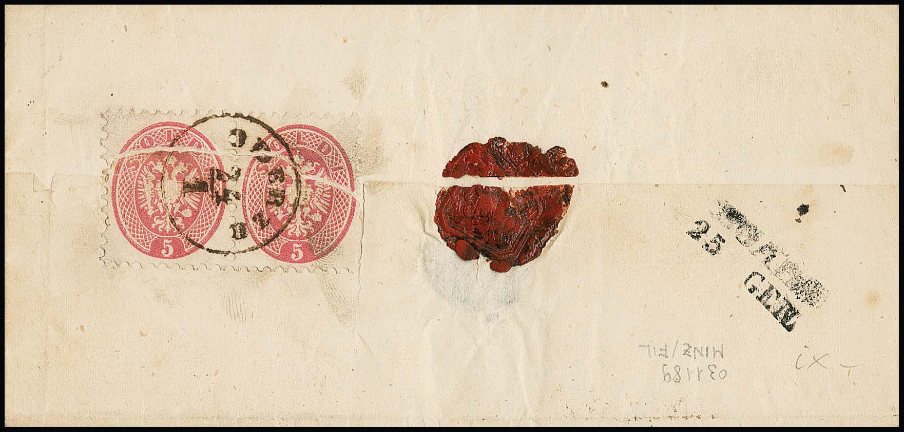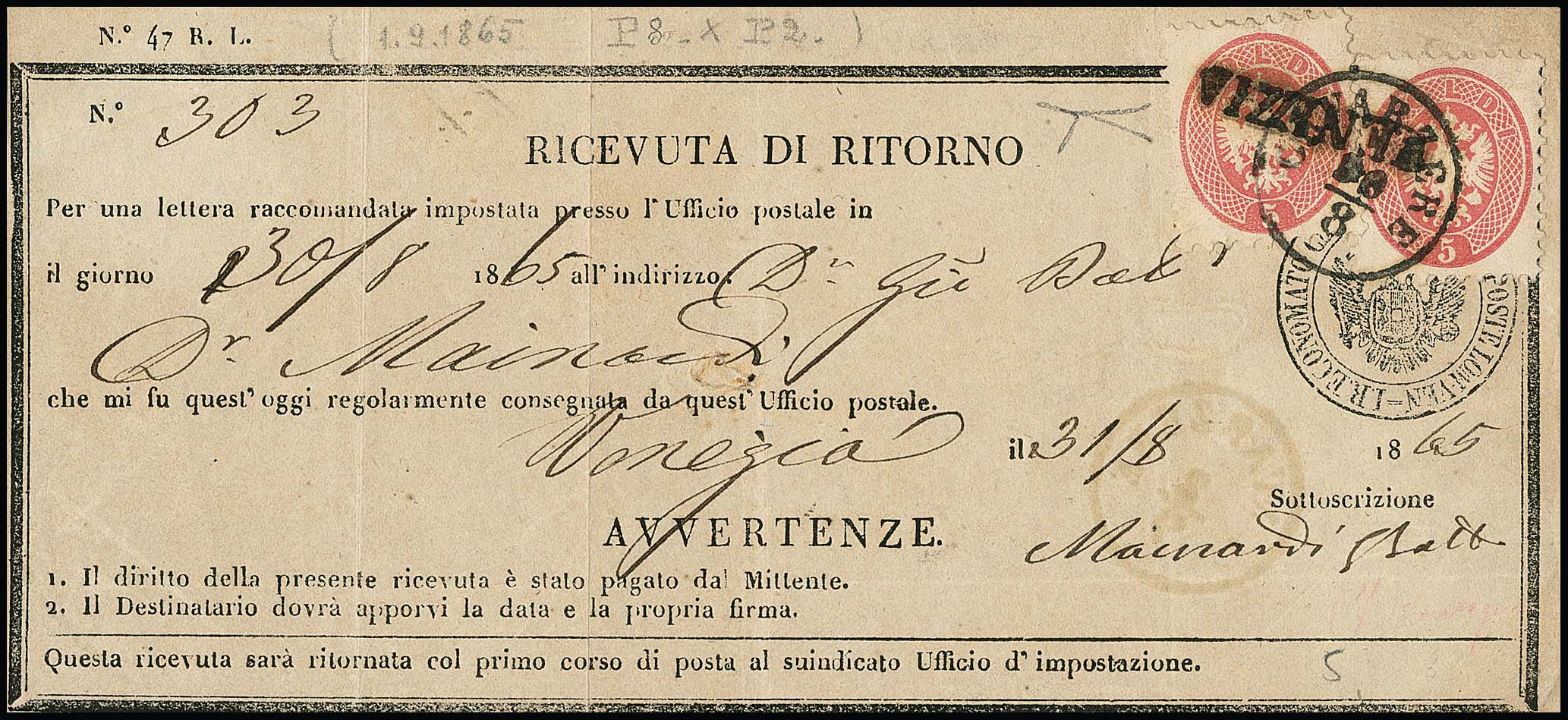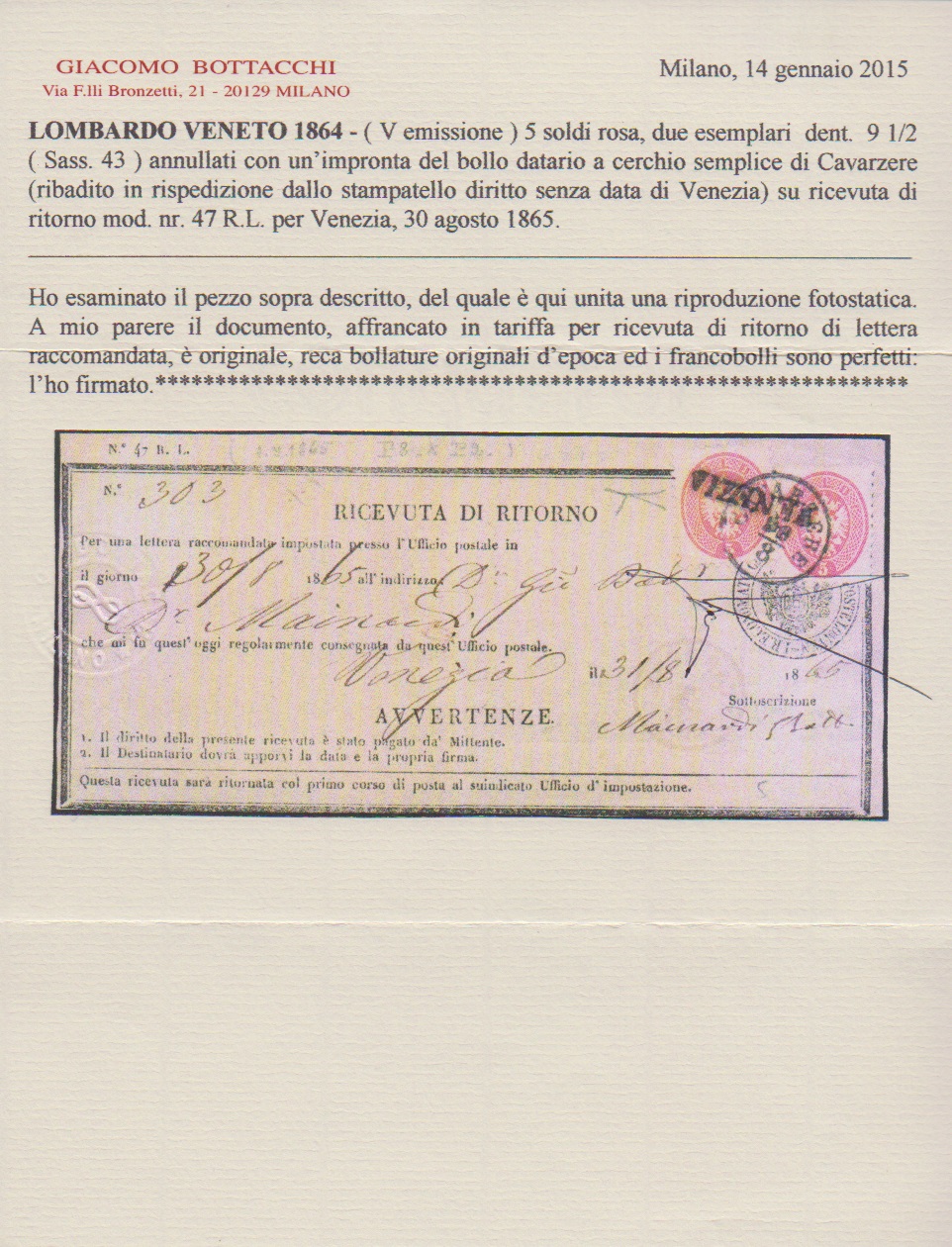 5 Sld. rosa, zwei perfekte Exemplare auf Retour-Recepisse mit Doppelentwertung durch K1 "Caverzere" und L1 "Venezia" (Müller 68b bzw. 259c, seltene Stempel). Attest Bottacchi