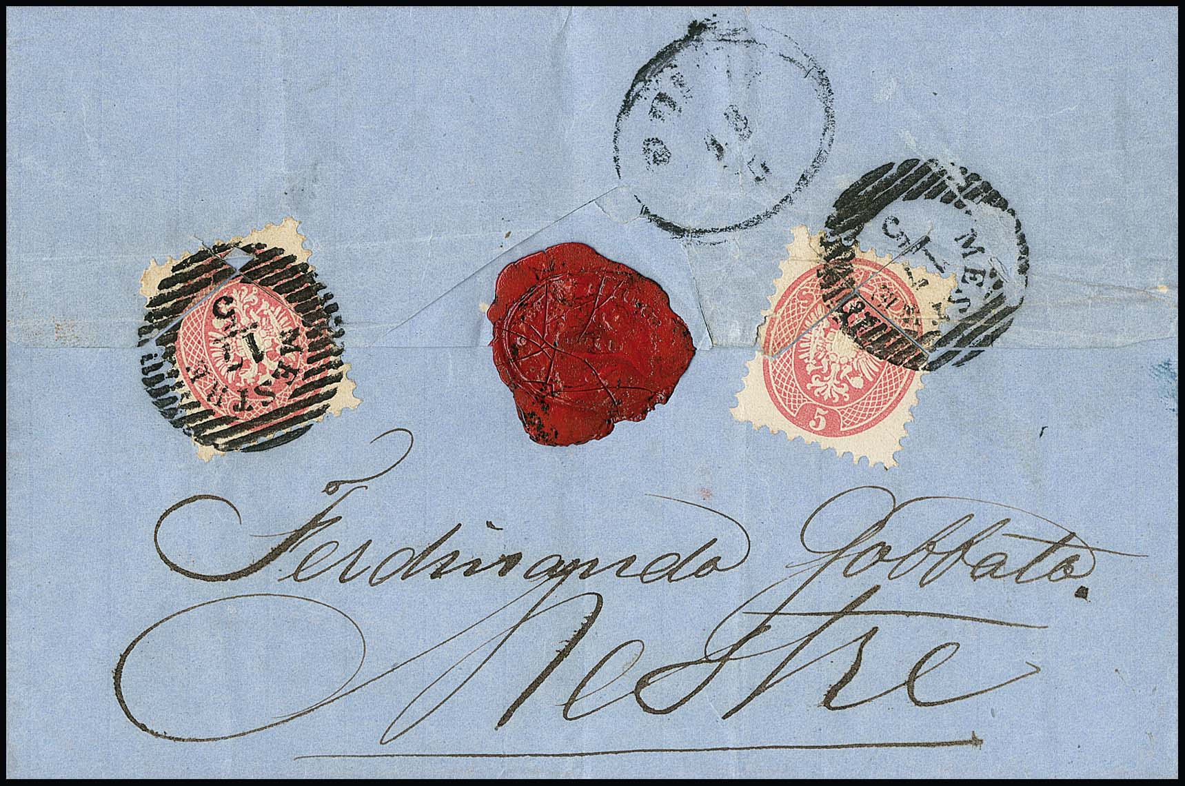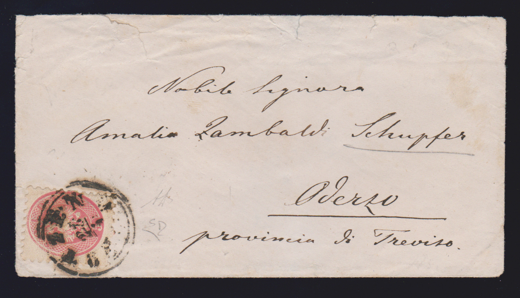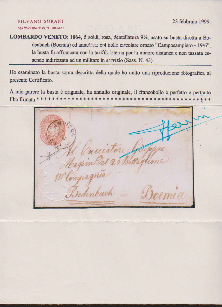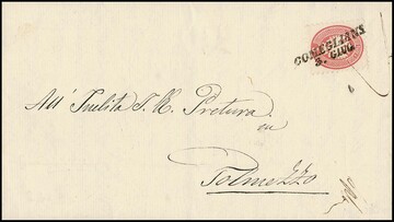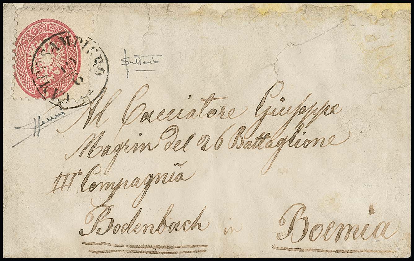 5 Sld. rosa auf Militär-Damencouvert mit seltenem K1 "Campo Sanpiero" nach Bodenbach in Böhmen. Das innen gestützte Couvert weist Mängel auf, jedoch seltene Frankatur-Variante mit dem Militär-Sondertarif, Müller 47b. Atteste Sottoriva und Sorani